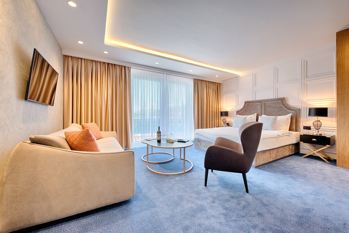 Comfortkamer met een grootte van 33 m2 met een tweepersoonsbed van 170/200 cm en een eenpersoonsbed van 90/200 cm. De kamer heeft een balkon met een prachtig uitzicht op het kleine strand en de oude stad. Alleen de straat scheidt het van het strand. De kamer heeft een badkamer en toilet van superieur design en moderne stijl. Kluis, tv, minibar, wifi en roomservice zijn beschikbaar voor onze gasten. Geniet van je ochtenden met uitzicht op de zee en de oude stad.