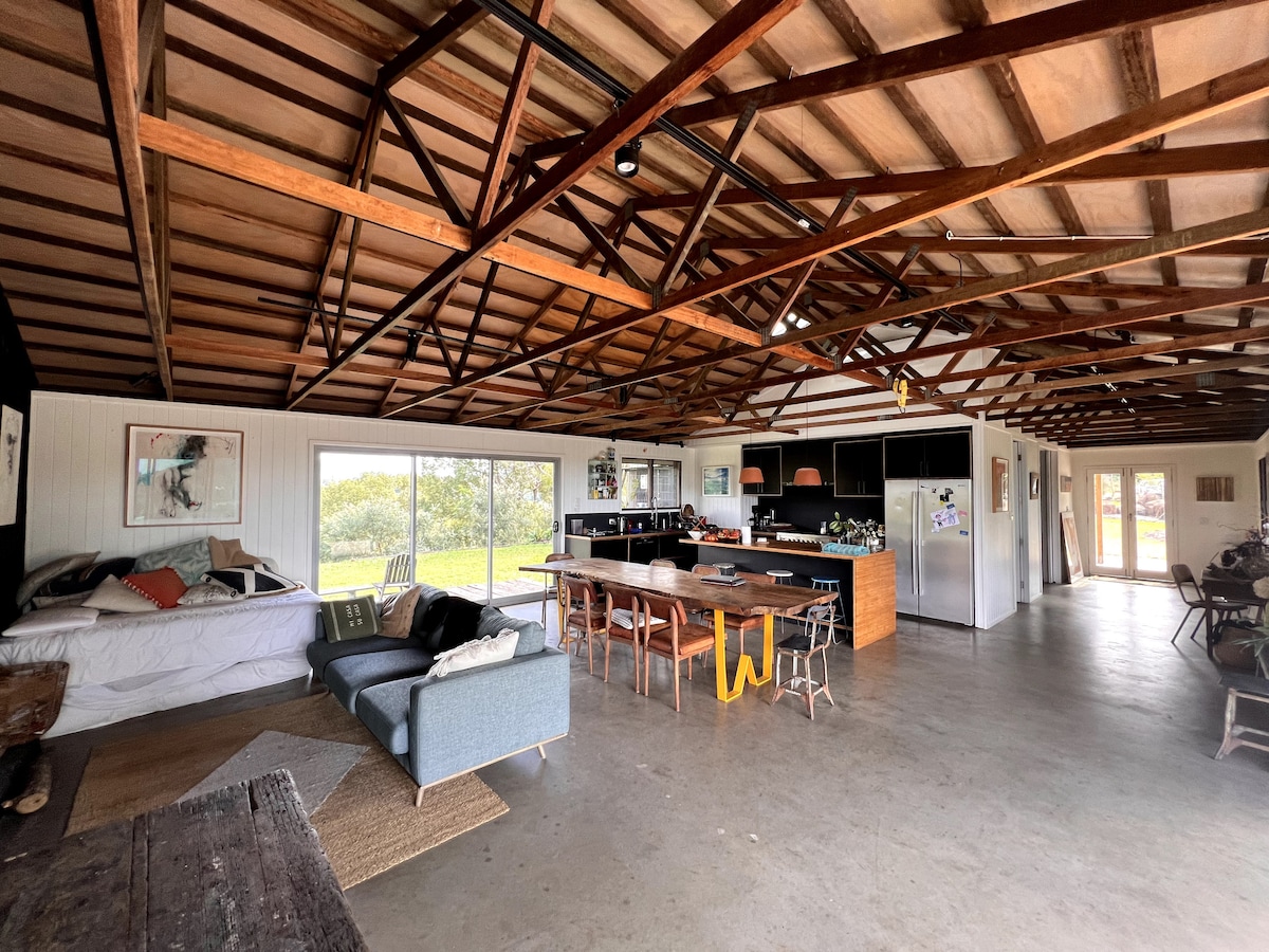 Rustic off-grid retreat on 116 peaceful acres. The Shed blends country charm with modern comfort - perfect for couples, families and pets. Enjoy open-plan living with a fully equipped kitchen and modern bathroom. The mezzanine bedroom offers a king bed, while downstairs offers a cosy lounge with a day bed that converts into a double for extra guests. Relax on the veranda and soak up the stunning views of Uki's mountains and valleys - the perfect spot for your morning coffee or sunset drinks.