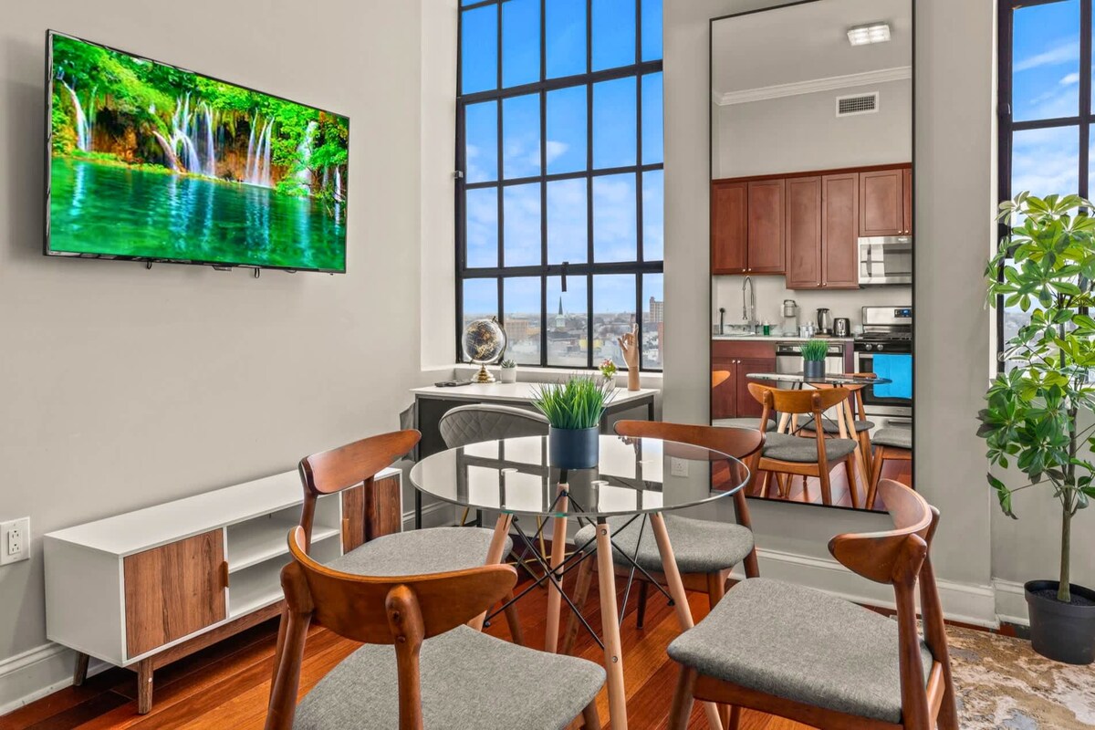 Ervaar verhoogd comfort in dit stijlvolle appartement met 2 slaapkamers en 1,5 badkamer met een eigen parkeergarage en een dakterras met een panoramisch uitzicht op de stad. Ideaal gelegen in de buurt van Freedom Mortgage Pavilion, Rutgers University, Cooper University Health Care en meer, je bevindt je in het hart van alles. Of je hier nu voor zaken, een medische rotatie, een groot concert of een ontspannen weekendje weg bent, dit stijlvolle appartement biedt comfort, gemak en een vleugje opwinding in de stad.