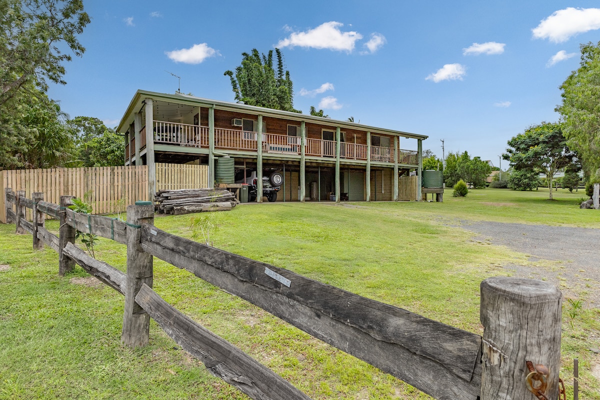 Just relax enjoying at beautiful river view overlooking Mary river and sugarcane fields on the front veranda. Just feel so free and chill out completely watching boats sail by with fantastic beautiful sunsets. Great for Honeymoons and families. Enjoy the lovely 7-acre gardens and fruit trees with river access and dams with birdlife. Have BBQ with outdoor sitting area or sit around the large fire pit. A peaceful quiet location between Maryborough and Hervey Bay in the peaceful river view.