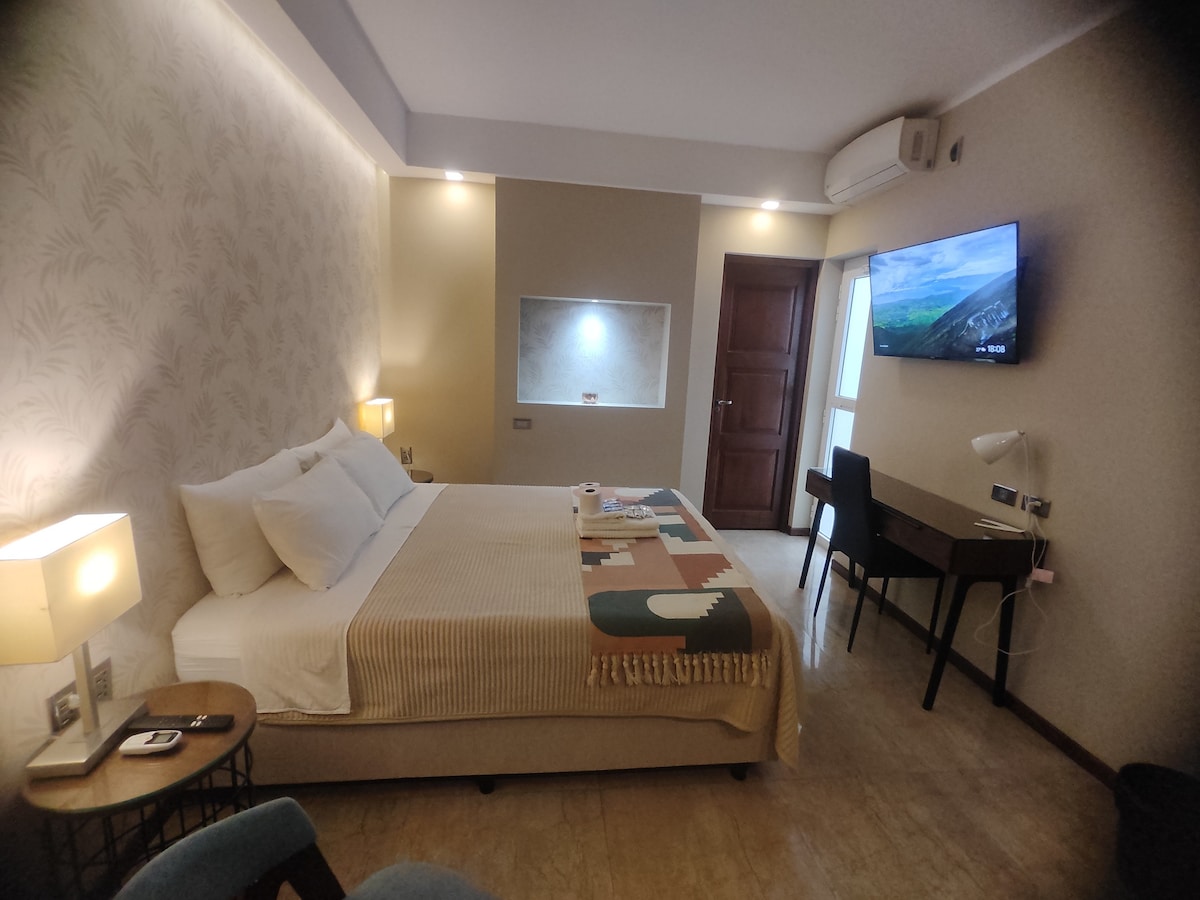 In the heart of Tarija city, on Las Américas Avenue, just a 3‑minute walk from the main square and cathedral, and close to restaurants, cafés, shops, and a 24‑hour pharmacy, this studio apartment is ideal for solo travelers or couples visiting Tarija. It includes: - A double‑size bed (2½‑plazas) - Kitchen sink and electric kettle - Table with chairs and dishware - Smart TV and Wi‑Fi - Private bathroom Shared amenities include a microwave, ironing board, and bottled water.