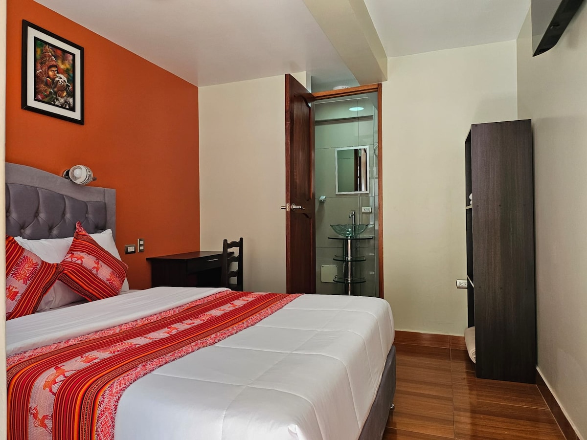De kamer HEEFT EEN TWEEPERSOONSBED en een eenpersoonsbed, toilet in de kamer. Persoonlijke schoonmaakspullen: drie handdoeken, een rol toiletpapier, twee stukken zeep, twee shampoobussen. Het heeft een kaarslicht, een wandhanger, een tafel (70 cm x 70 cm) MET TWEE stoelen, een deurmat. Het heeft een vaas met een kopie van de bloemen die inheems zijn in het gebied, twee schilderijen gemaakt door Cusco-kunstenaars.