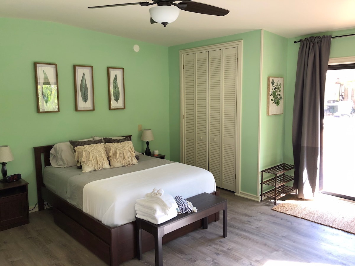 Zonne-energie, batterij back-up! Ons ruime studio-appartement ligt verscholen tussen een paradijs van palmbomen, met een 'boomhut'-sfeer. Op slechts een korte wandeling afstand, ontdek de allure van een nabijgelegen strand en resort, met twee restaurants, een markt en een zwembadbar om ultiem te ontspannen. Omarm de buitensfeer op onze patio, compleet met comfortabele zitplaatsen en een grill, perfect voor dineren in de buitenlucht. Houd er rekening mee dat de studio een muur deelt met een andere huureenheid. Parkeergelegenheid beschikbaar!