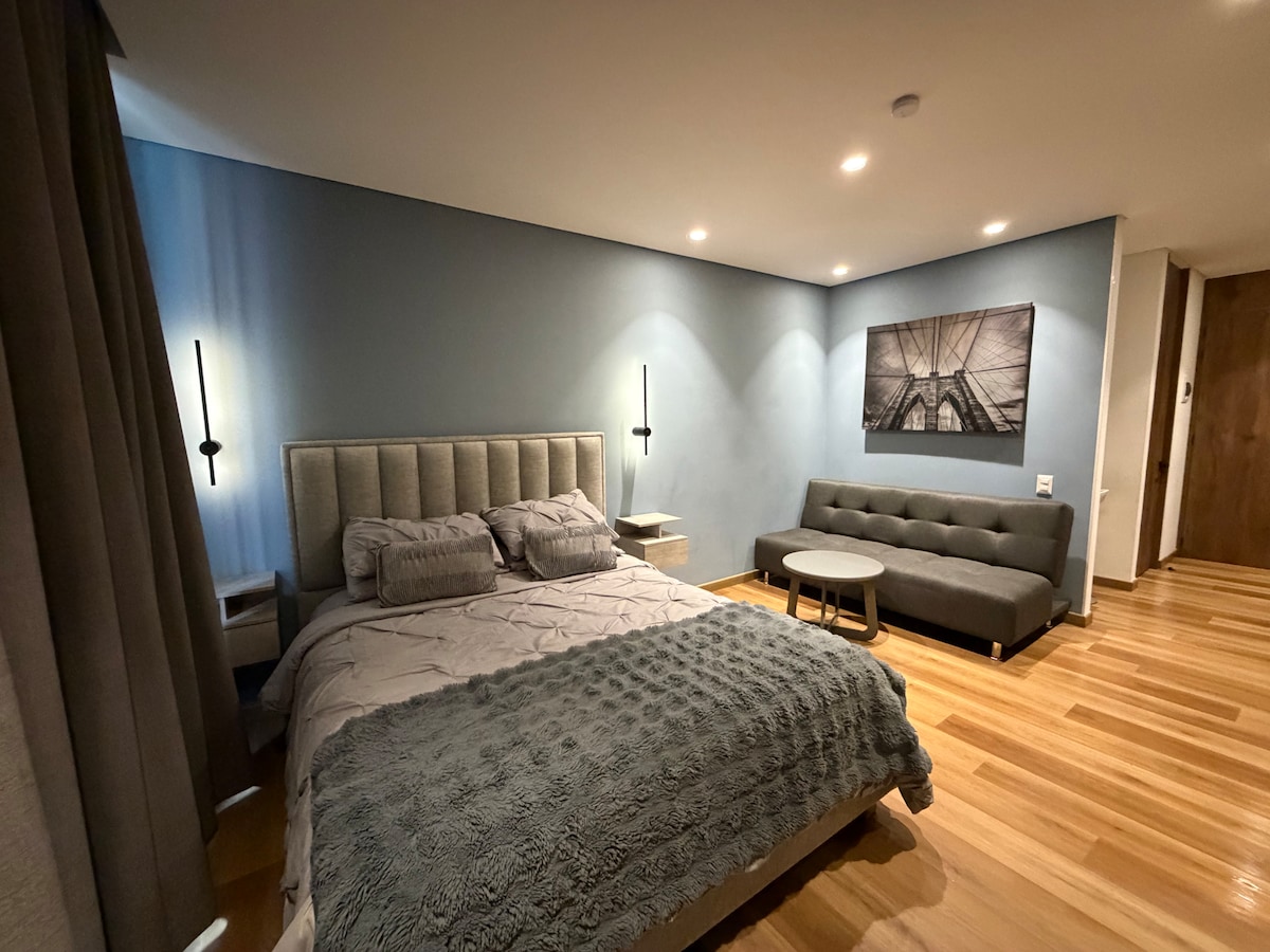 Gloednieuwe luxe designstudio in Bella Suiza met eigen terras van 20 m², 2 badkamers, smart home-systeem en Zwitserse vezelgeldekbedden. Geniet van premium toiletartikelen van Olfa, Nespresso-capsules, een vaatwasser en uit de VS geïmporteerde waspods. Veilig gebouw met 24/7 conciërge. Gasten van 18 jaar en ouder moeten zich alleen registreren met een legitimatiebewijs bij de receptie. Roken (alleen sigaretten) toegestaan op het terras. Loop naar cafés, Carulla en Usaquén. Privé parkeren inbegrepen.