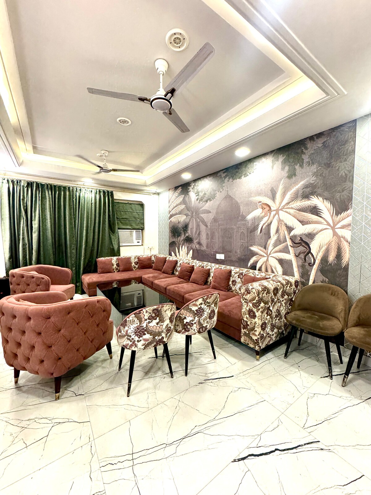Ons betoverende pand ligt in het hart van Delhi en biedt een toevluchtsoord van rust te midden van het bruisende stadsgezicht. Stap in onze privéparadijs versierd met weelderig groen en seizoensfruit Geniet van de betoverende sfeer van onze meerkleurige verlichting in de hal, werp een zachte gloed op onze zachte 12-zitsbank en nodigde je uit om weg te zakken in zalige ontspanning. Voor de moderne nomade zorgt ons snelle internet voor een naadloze productiviteit te midden van de gemakken van thuis.