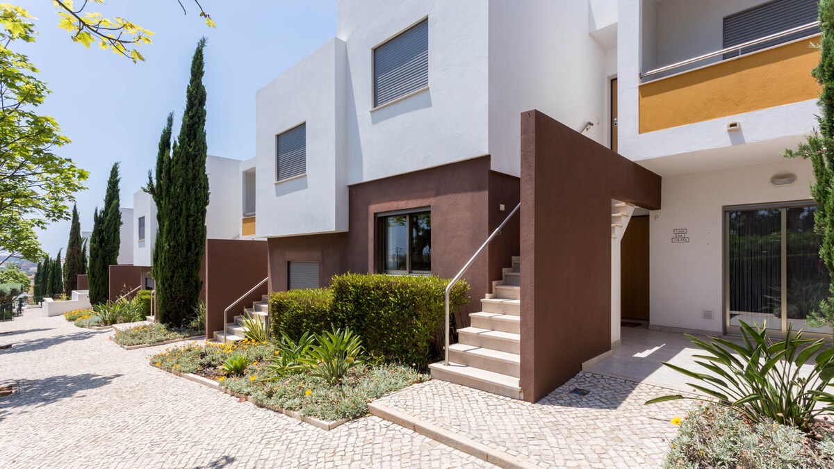 Modern appartement 90m², airconditioning, 2 slaapkamers, 2 badkamers met douches, grote woonkamer en volledig uitgeruste keuken. Terras met uitzicht op prachtige tuin en zwembad. Eigen parkeerplaats. Gesloten en rustig appartement. Op enkele minuten afstand van de stranden Galé en Salgados. Perfect voor een rustige vakantie! Lakens en handdoeken aanwezig. Schoonmaak van het huis inbegrepen.