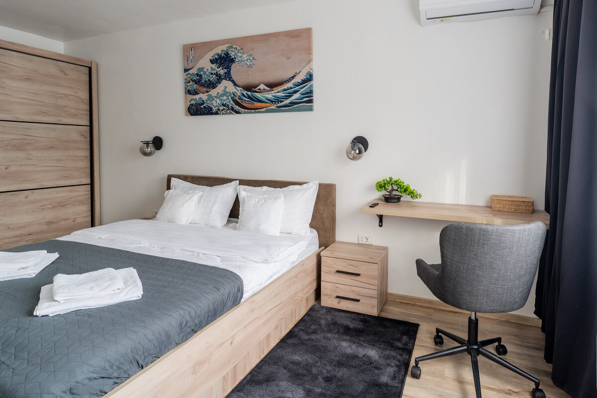 Silent Wave Apartment — a bright, modern studio perfect for active travelers and remote workers. Really close to Country Hospital and reasonable close to International Airport.Enjoy a cozy double bed, warm wood accents, natural light, and a stylish wave artwork that sets the vibe. With a sleek workspace, AC, and minimalist décor, it’s the ideal spot to relax, recharge, and enjoy a quiet, well-designed space.