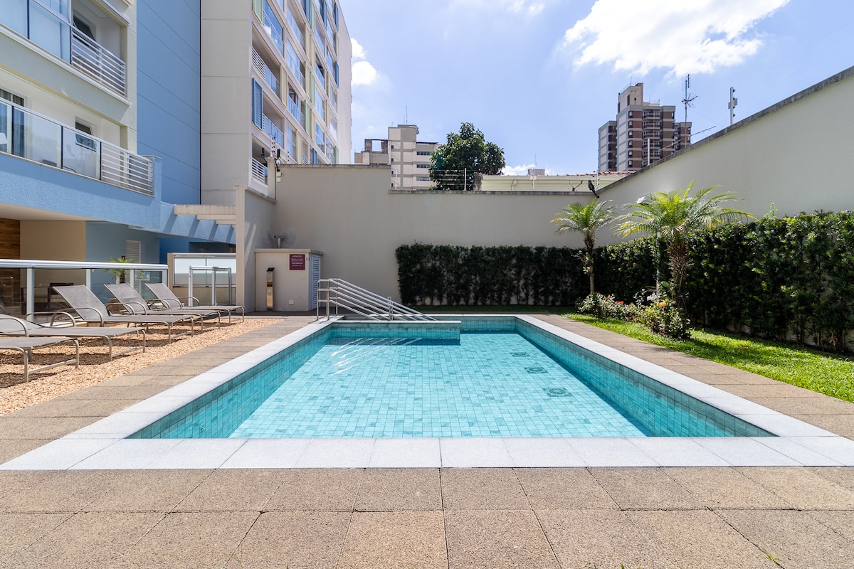 Moderne en luxe studio van 51m ² aan de Rua Duque de Caxias, 880, vlakbij het stadscentrum en Cambuí. Exclusief voor jou, zonder gedeelde ruimtes. Dicht bij bars, restaurants, supermarkten en cafés. Volledig uitgerust met bed- en badlinnen, een complete keuken, een tweepersoonsbed met een extra eenpersoonsbed, een kledingkast met een spiegel, warm water, een Dolce Gusto-koffiezetapparaat, 2 airconditioners en een 50inch tv met Netflix en apps. Condominium met geweldige voorzieningen en parkeergelegenheid.