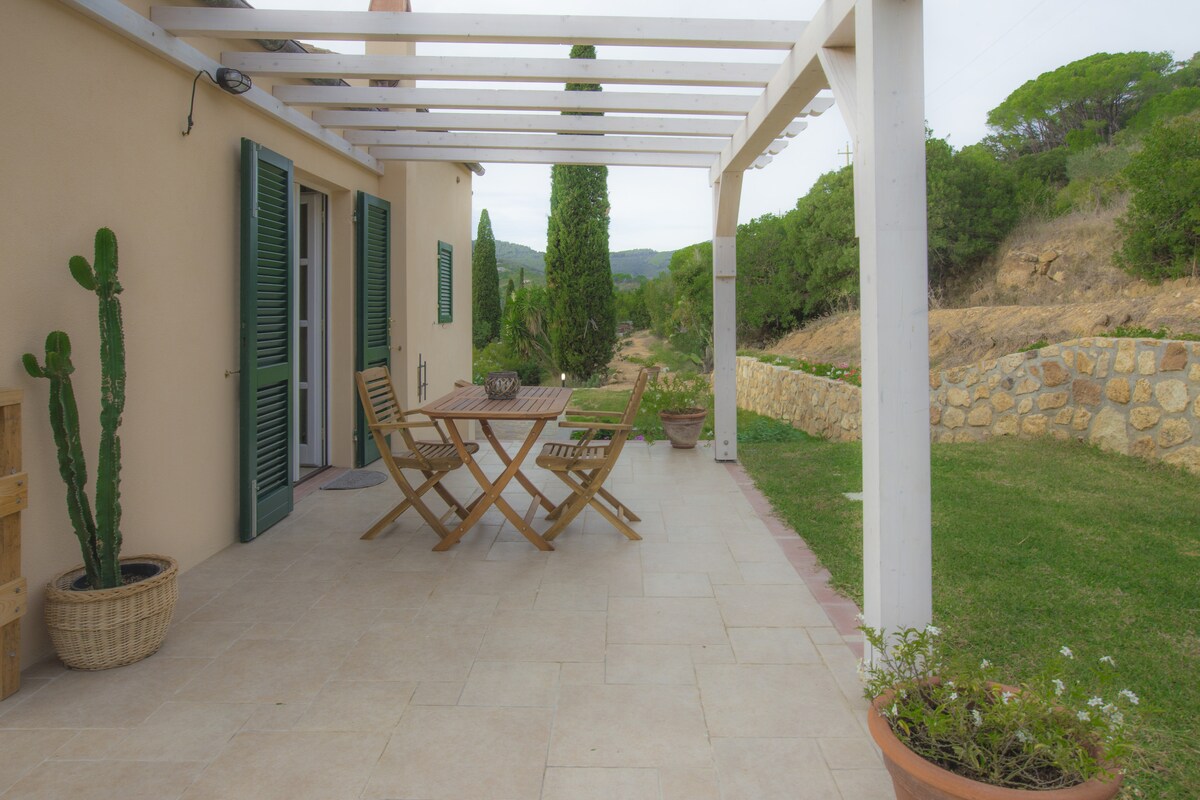 Delizioso appartamento arredato con cura, in stile etnico, provvisto di ogni comfort, in un casolare appena ristrutturato secondo i principi della bioedilizia, immerso nella macchia mediterranea del più bel versante dell'isola d'Elba, con vista mozzafiato sull'arcipelago toscano e sulla Corsica, a 250 m sul livello del mare, dominante la spiaggia di Cavoli. L'appartamento è composto di soggiorno con angolo cottura e divano-letto per due persone, camera matrimoniale e bagno con doccia e ampio spazio esterno attrezzato per pranzare e prendere il sole. Il luogo è raggiungibile con una strada sterrata di 2,5 km dal paesino di San Piero in Campo (fin dove arrivano i mezzi pubblici), distante pochi minuti di macchina dalle spiagge più incantevoli dell'isola (Cavoli, Seccheto, Fetovaia) e dal centro turistico e commerciale di Marina di Campo. E' consigliabile disporre di un mezzo proprio. La casa è immersa nella tipica macchia mediterranea alternata a grandi e suggestive scogliere di granito. Il grande giardino è recintato, contiene un orto e un uliveto. Non vi sono altre abitazioni nei dintorni. Intorno alla località si snodano i più suggestivi sentieri per gli amanti del trekking e della mountain bike. Ideale per chi è in cerca di silenzio, relax, aria pura, e ama la natura e i luoghi un pò speciali. I padroni di casa potranno aiutarvi per ogni evenienza e perplessità. BREATHTAKING VIEW ON THE ARCHIPELAGO Charming apartment,furnished in ethnic style,with every comfort,in an old cottage just renovated according to the bioarchitecture,amidst the Mediterranean bush in the most beautiful part of Elba island with breathtaking views on the Tuscan archipelago and (email hidden) a.s.l.,overlooking famous Cavoli beach. The apartment has a living room with kitchenette and divan bed for two persons,a double bedroom and a bathroom with shower and a large outside patio for eating and sunbathing. You can reach the place through a 2,5 Km dirt road from San Piero in Campo,where pubblic transport ends,and from where ,in few minutes by car you can get to the best beaches of the island (Cavoli,Seccheto,Fetovaia etc.),and to the touristic and service centre of Marina di Campo. It's better to have your own car or motorbike(you can rent it anywhere on the island). The house is surrounded by the typical mediterranean bush scattered with huge granite cliffs. The large garden has an olive grove and a vegetable garden. The place is secluded and there are no other houses in the surroundings. It's an ideal place for trekking and mountain biking and lovers of relax,peace,nature and special places. Your host are ready to help for any need and request.
