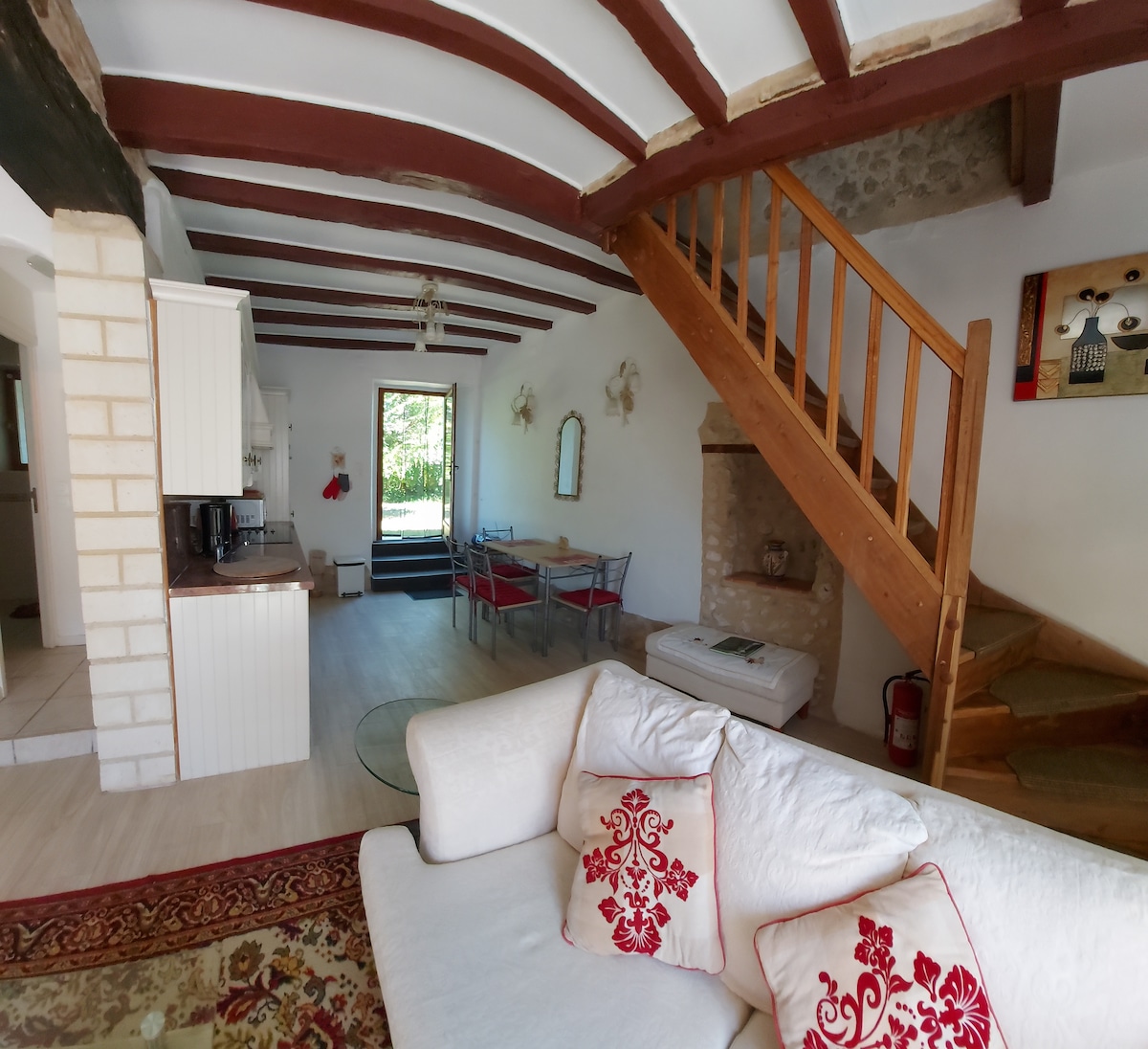 Het bestaat uit een volledig uitgeruste volledig uitgeruste keuken, woonkamer woonkamer. Boven, een master suite met slaapkamer, badkamer en kleedkamer. Er zijn twee toiletten waarvan waarvan één boven. Beddengoed en handdoeken aanwezig. Ideaal voor 2 volwassenen, een extra bed is mogelijk op de bank ( 1 stoel) Mogelijkheid om op verzoek een kinderbed toe te voegen. Er is een gemeenschappelijke binnenplaats bij een verzekeringsmaatschappij. Eigen parkeerplaats. Gelegen in het stadscentrum van Ribérac met uitzicht op het Parc de la Mairie