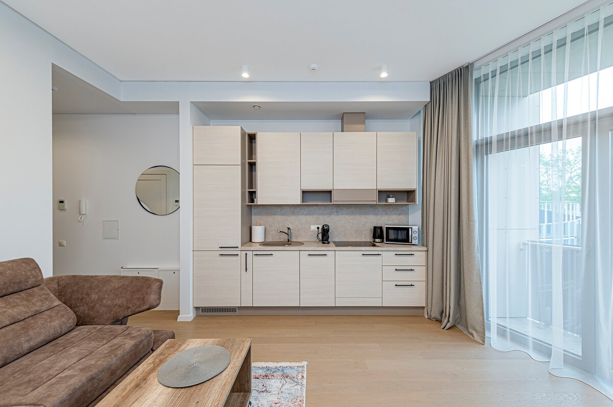 Ontspan in een gezellige studio midden in het centrum van resort Druskininkai – een nieuwbouw, Nemunas-project. Hier vind je alles wat je nodig hebt voor een comfortabel verblijf: modern interieur, volledig uitgeruste keuken, comfortabel bed, balkon met uitzicht op de groene natuur. Slechts een paar minuten lopen naar het waterpark, spa's, restaurants en de Nemunas Coastal Walkways. Een geweldige keuze voor zowel stellen als soloreizigers die op zoek zijn naar rust en stilte.