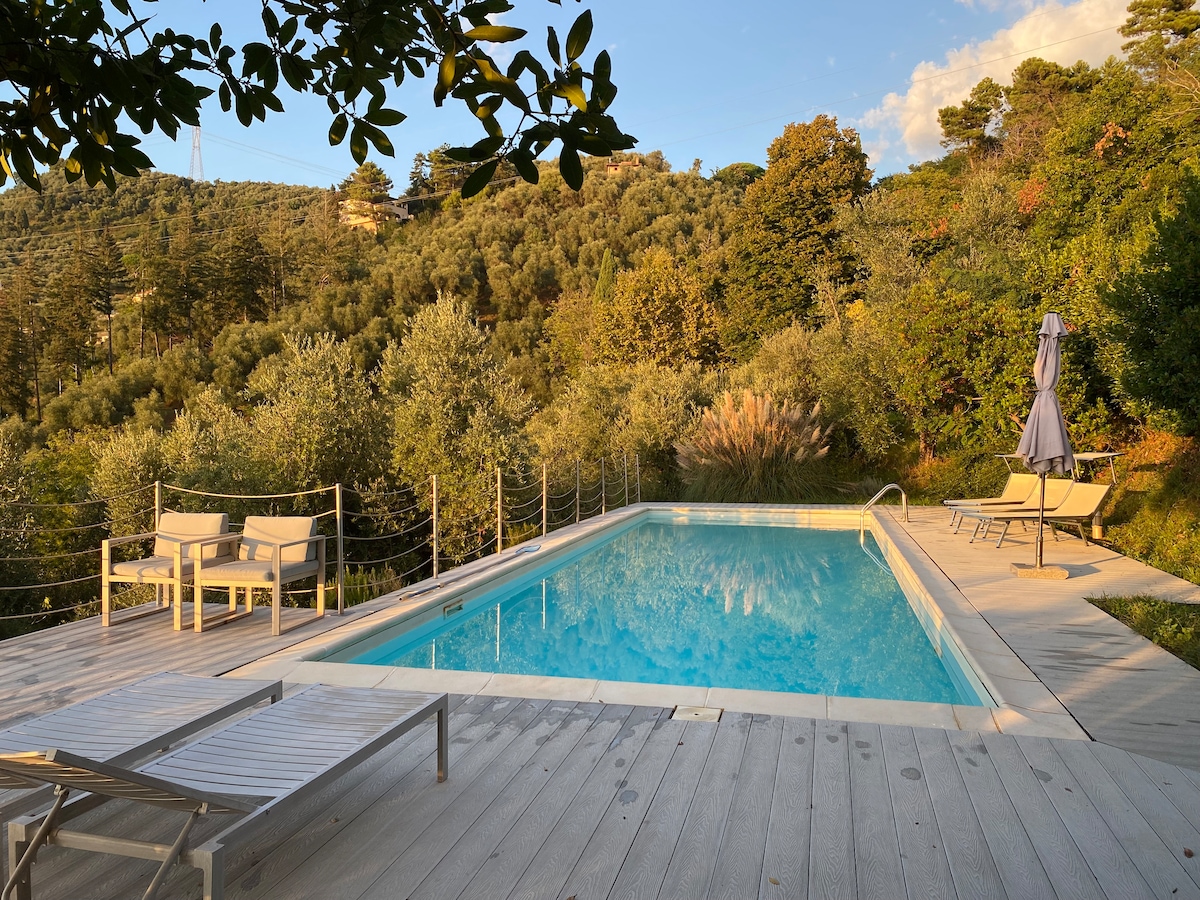 Villa met prachtig uitzicht op de Ligurische bergen, bestaande uit slaapkamer met badkamer, woonkamer en keuken; allemaal omgeven door een weelderige tuin met terras, barbecue en heerlijk zwembad. Parkeergelegenheid is aanwezig met de mogelijkheid om elektrische auto's op te laden.