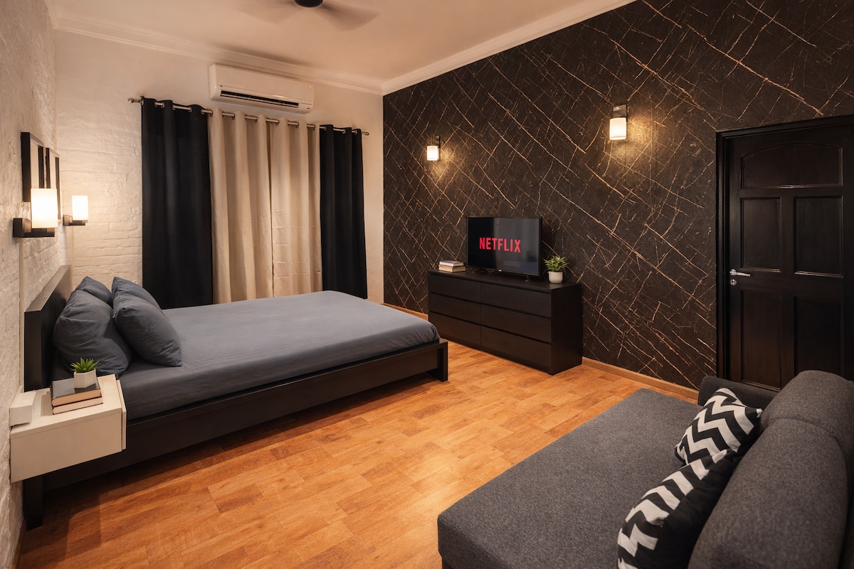 Ontsnap naar deze stijlvolle 1BHK, op slechts enkele minuten van Versova Beach! De ruimte met airconditioning beschikt over een comfortabel bed, een volledig uitgeruste keuken (koelkast, magnetron, basisvoorzieningen) en een gezellige woonkamer met een smart-tv. Geniet van warme verlichting (slingers, zachte lampen) voor een ontspannen sfeer, plus een wasmachine en 24/7 warm water. Op een steenworp afstand van het strand, cafés en lokale markten, is het perfect voor stellen of kleine gezinnen. Snelle wifi en schoon beddengoed inbegrepen voor een probleemloos verblijf!