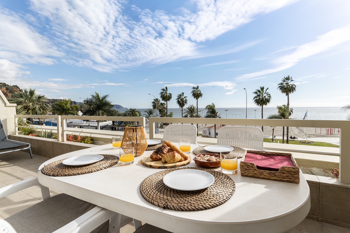 Mooi appartement aan het strand met een fantastisch uitzicht op de Middellandse Zee, gemeenschappelijk zwembad in de zomer, eigen parkeerplaats, snelle glasvezel wifi, 50inch flatscreen-tv, airconditioning, airconditioning, Almuñécar, Playa de Velilla, Costa Tropical, Intiyan gebouw. Alle diensten op loopafstand (supermarkt, apotheek, slager, restaurants, winkels, fruitwinkels). Het ruime terras, de woon-eetkamer en de keuken hebben een prachtig uitzicht op het strand en de zee.