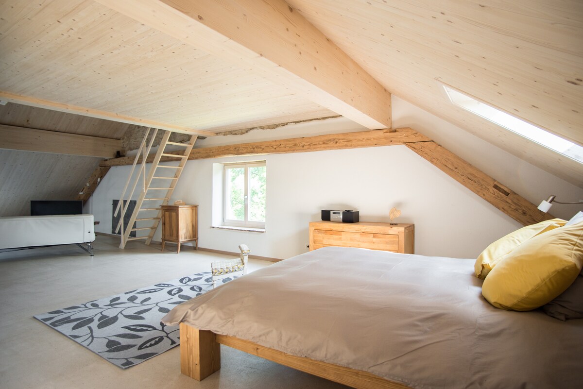 Lichte en gezinsvriendelijke zolder dicht bij voorzieningen (Migros, Denner, Coop Pronto, Bars & Restaurants, Porrentruy Old Town) op vijf minuten lopen. Dicht bij de botanische tuin en het nieuwe Jurassica-museum, zal dit rustige toevluchtsoord je tevreden stellen voor een aangenaam en comfortabel verblijf. Eigen bijgebouwkamer toegankelijk voor het bijvullen van fietsen, wasdrogen en allerlei soorten opslag. Onbeperkt privéparkeren!