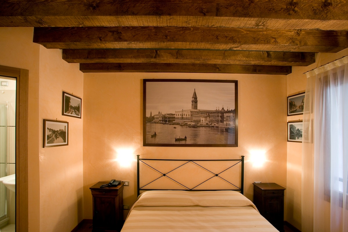 Mooie slaapkamer, met een eigen badkamer en een aparte ingang met een veiligheidsdeur. Op minder dan 5 minuten lopen van Piazzale Roma of het station. Het is gelegen op de tweede verdieping van het gebouw, heeft hoge plafonds met zichtbare balken en houten vloeren. De faciliteiten en meubels zijn nieuw, comfortabel en modern. De lichte en geventileerde kamer kijkt uit op een typisch Venetiaanse binnenplaats. Van 1570 tot vandaag, elke zondagochtend om 10:30 uur komen er live gregoriaanse gezangen en wierook in het huis. Geen airco.