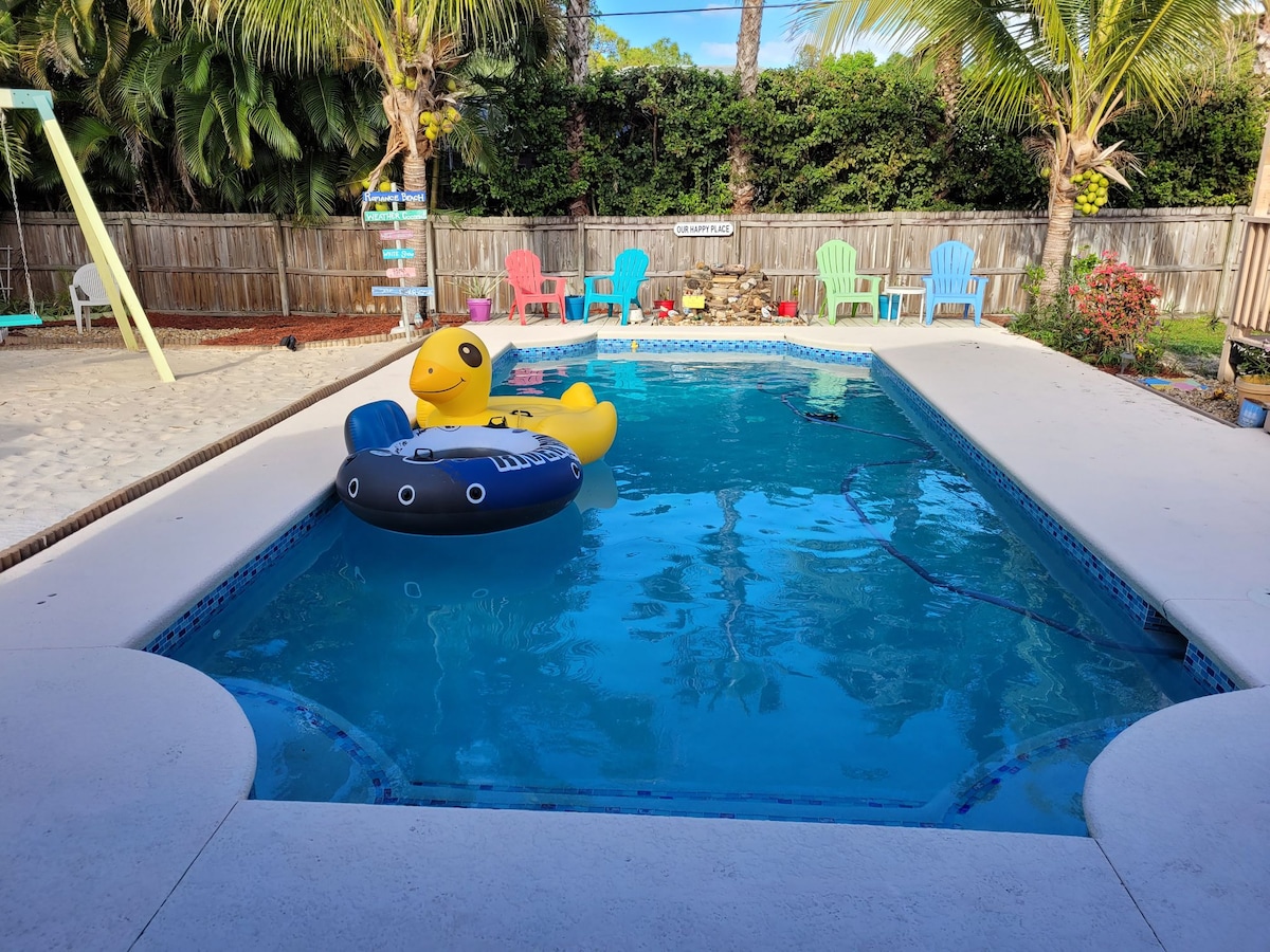 Ontsnap naar The Palm House! Met een gloednieuw zoutwaterzwembad, fontein en buitenkeukenoase! Onlangs voltooid zwembad is een tropische droom! Gelegen op slechts 15 minuten van het strand. Open concept grote kamer met een chef-kokskeuken en tropisch uitzicht in alle richtingen. Geniet van een echte indoor outdoor ervaring in Zuid-Florida met 20 voet schuifregelaars die openen naar de patio. Aangepaste en moderne accenten in elke kamer! Je zult genieten van de luxe ingebouwde stapelbedden! Stijlvolle slaapkamers met ruimte voor 8 personen.