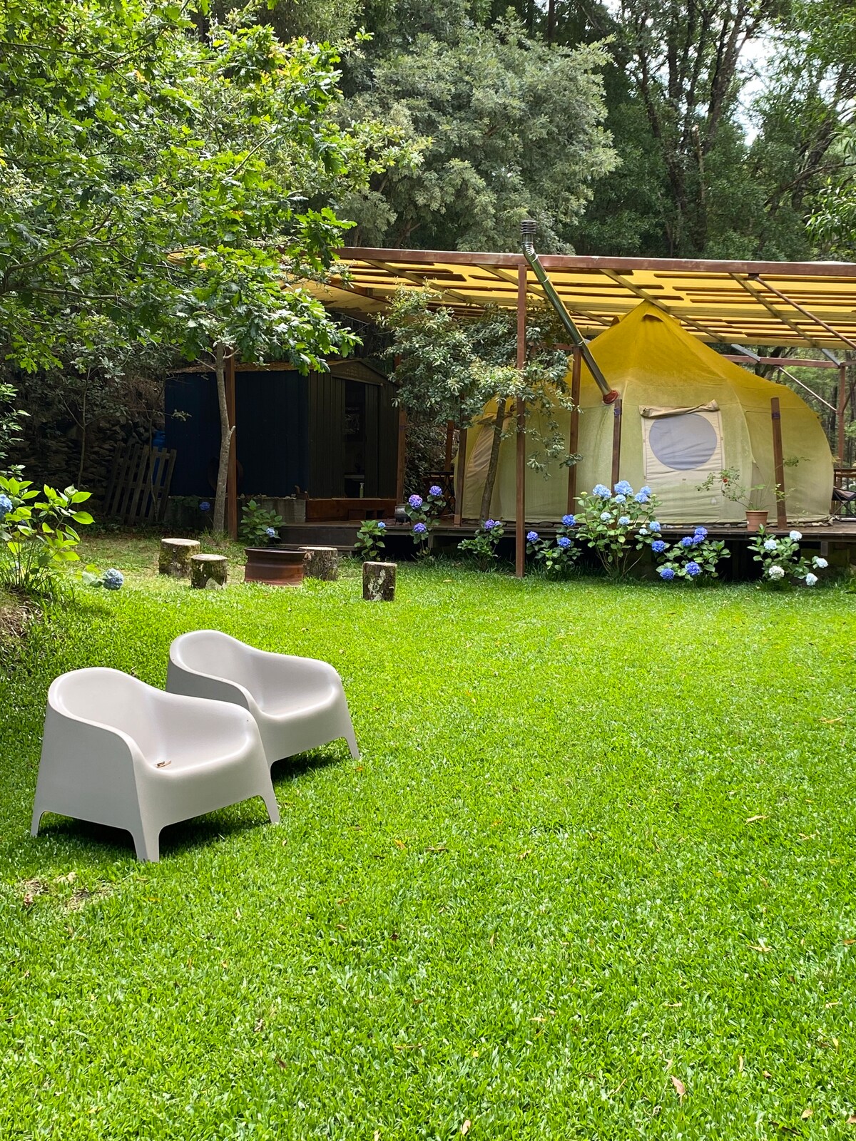De perfecte plek om los te komen van de wereld en in contact te komen met de natuur, waardoor je fysieke en mentale gezondheid verbetert. Onze glamping is exclusief gebruik, dus het is alleen voor jou tijdens het hele verblijf. Je krijgt een grote slaapkamer (20m2) met een houtfornuis binnen voor gezellige nachten Je hebt een eigen badkamer met warm water en een kitchenette met gasfornuis, bestek, servies en minikoelkast. Buiten de slaapkamer vind je een houten bubbelbad met een prachtig uitzicht over de watervallen en de rivier Geen tv en geen wifi ter plaatse!