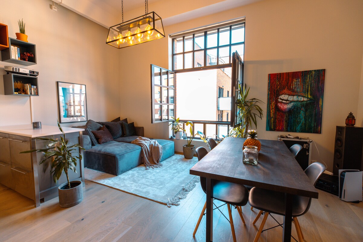 Dit appartement was een oude fabriek, herbouwd in 2020 en heeft een plafond van 4 meter (13 voet). Alles wat je nodig hebt is in deze gezellige en coole kleine grote ruimte. De woonkamer is uitgerust met een projector die rechtstreeks op de grote witte muur projecteert, en met de verbonden Chromecast kun je de kamer transformeren in een bioscoop. Het grote raam heeft automatische jaloezieën die op en neer gaan wanneer je wilt. Er is een grote douche en de keuken heeft een wijnkoeler.