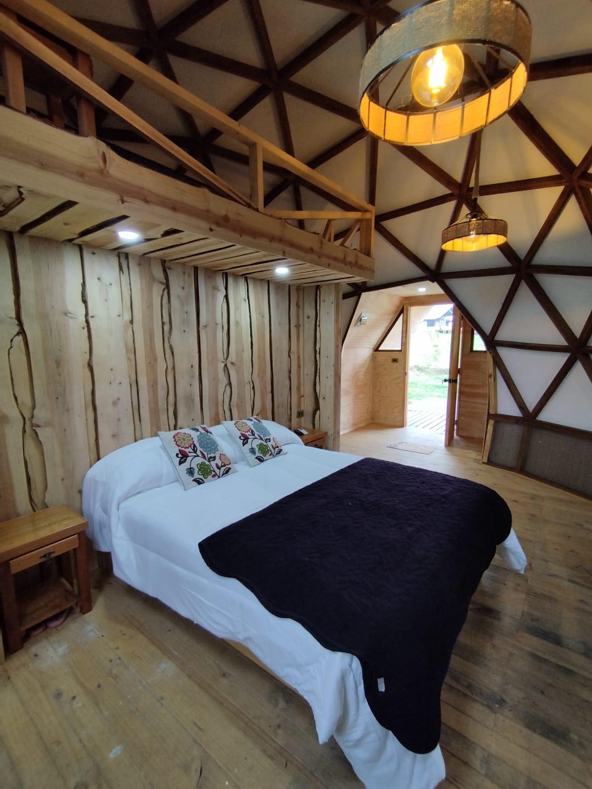 Een vredig toevluchtsoord midden in het bos Stel je voor dat je wakker wordt met het zachte geruis van de wind tussen de bomen, zuivere lucht inademt en de sereniteit van de natuur om je heen voelt. Onze gezellige koepel, omgeven door een klein inheems bos, is de perfecte plek om los te komen van de wereld en jezelf te vinden, het heeft twee bedden, uitgeruste keuken, terras en privéparkeergelegenheid. Deze schuilplaats geeft je de gelegenheid om de routine te pauzeren, diep adem te halen en gewoon te zijn.