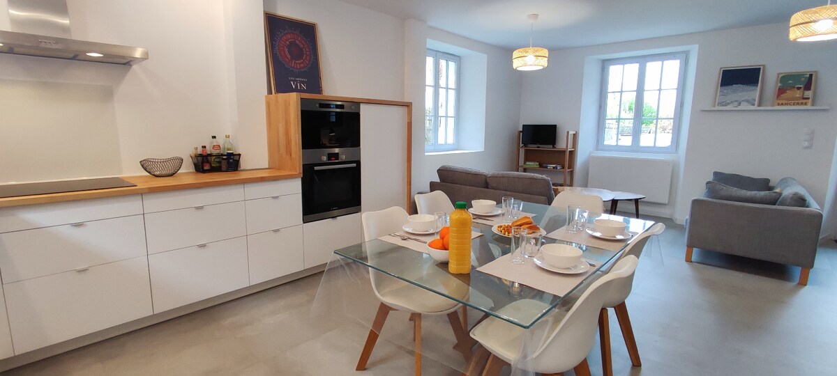 Huis volledig gerenoveerd voor 6 personen, in een typisch dorp aan de voet van Sancerre. 3 slaapkamers inclusief 2 slaapkamers boven met een badkamer per verdieping. 1 toilet op de begane grond, tuin met uitzicht op de wijngaard, overdekte zomerlounge, privéparkeergelegenheid, alle comfort in een verfijnde landelijke stijl. Lakens, badhanddoeken en theedoeken zijn aanwezig. activiteiten: wijntoerisme (Sancerre, Pouilly...) 18-holes golf, kanoën, de Loire op de fiets, St Fargeau (geluids- en licht), Guedelon, Briare, Morvan en zijn meren