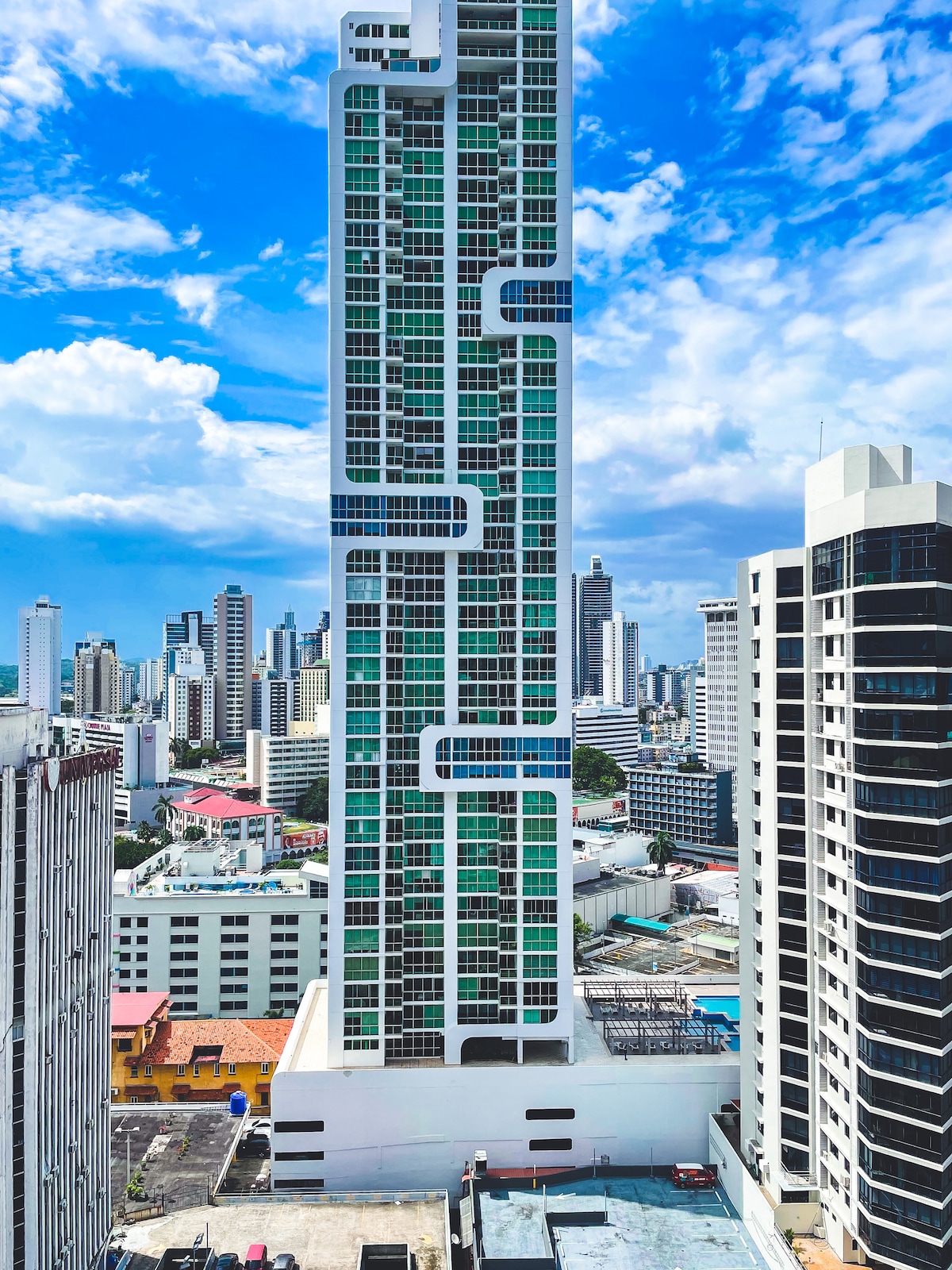 Calle 50 is het Times Square van Panama City. Deze karakteristieke straatschuilplaatsen in de drukke bankruimte. De locatie van het appartement is uitzonderlijk en centraal gelegen, dicht bij: ->Estación Iglesia del Carmen [Panama Metro Line 1] ->Cinta Costera ->Parque Urracá ->Supermercado Rey ->F&F Tower ("Tornillo" Building) ->Nachtleven en Calle Uruguay Vanaf de 19e verdieping wordt uitzicht op de stad en de jungle aangeboden.