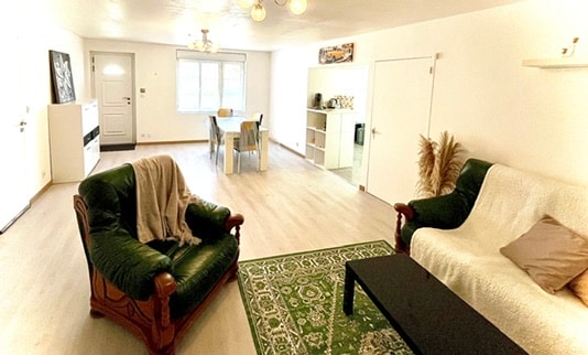 Ik bied je een huis op 1,5 km, bereikbaar via het wandelpad. Dit huis van 100 m² bestaat uit een ingang met een volledig uitgeruste keuken, een lounge en eetkamer met grote glazen ramen, internet-tv, 3 slaapkamers, eigen tuin met tuinmeubilair. zeer comfortabel, warm, rustig en geen overlast. Voor zeer respectvolle mensen. Info: voor mensen die alleen willen boeken is de prijs € 200 in het weekend, € 500 per week.