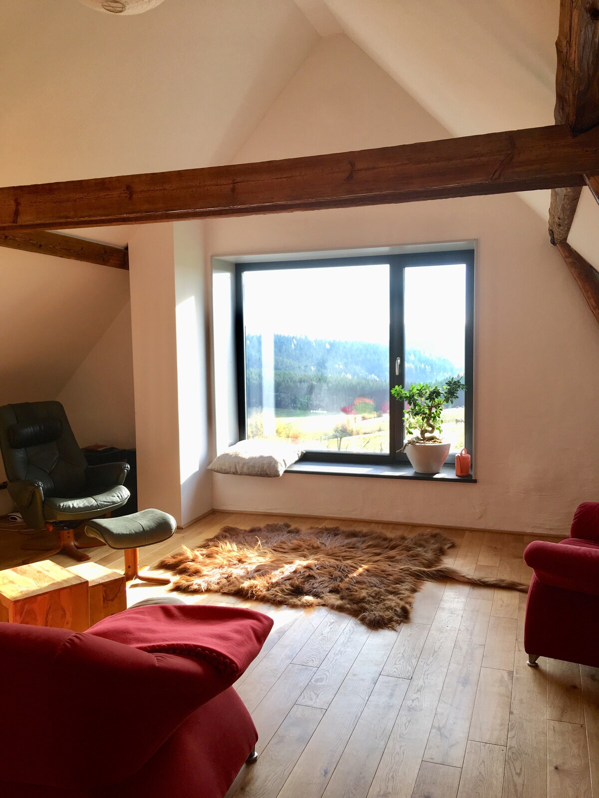 In het Ertsgebergte in de buurt van Karlovy Vary en Boží Dar, in een klein dorpje, creëerde ik ons toevluchtsoord. Een gevoelig gereconstrueerde zolder met uitzicht op de natuur en een bubbelbad op het terras (tegen betaling) en een thuisbioscoop. We lenen je graag onze plek. De gehele ruimte, inclusief het terras, is beschikbaar voor jou. We helpen je een reis te plannen en de schoonheid van het Ertsgebergte te ontdekken. We zorgen voor onze plek met liefde en zorg. We willen dat je je hier ook thuis voelt. Bergen, natuur en een kuuroord, er is hier een beetje van alles!