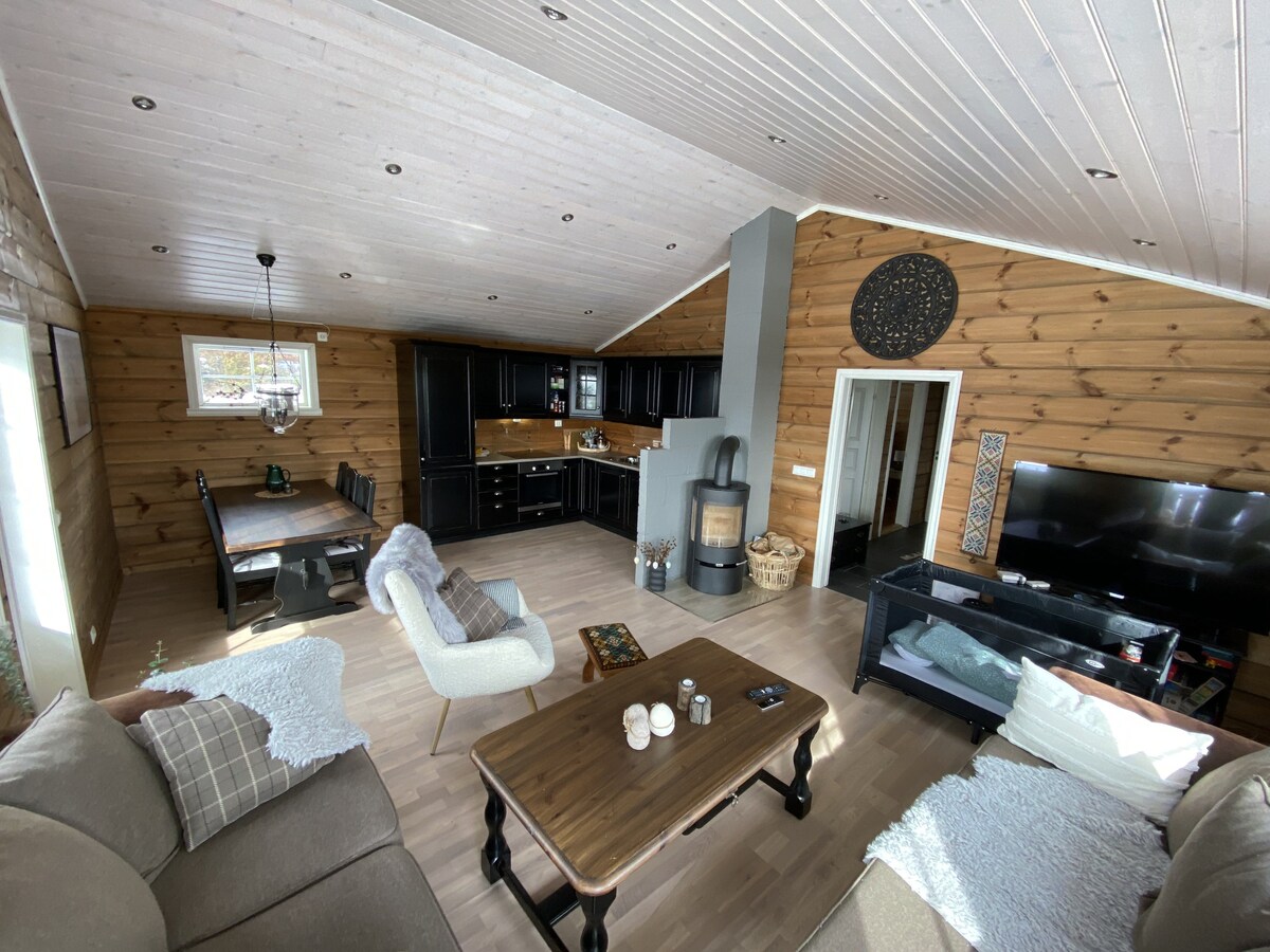 A welcoming guesthouse with three bedrooms, two living rooms and capacity for up to 12 guests. The house offers a fully equipped kitchen, bathroom, dining area, fireplace and Wi-Fi. Loft with bedrooms and living room with TV. Outside a spacious terrace, hot tub, grill area, big lawn, trampoline and beautiful views. Perfect for both families and groups all year round. There is also available toilet next door. Washing machine (NOK 100 per load). Electric car charging is NOK 200 per charge.