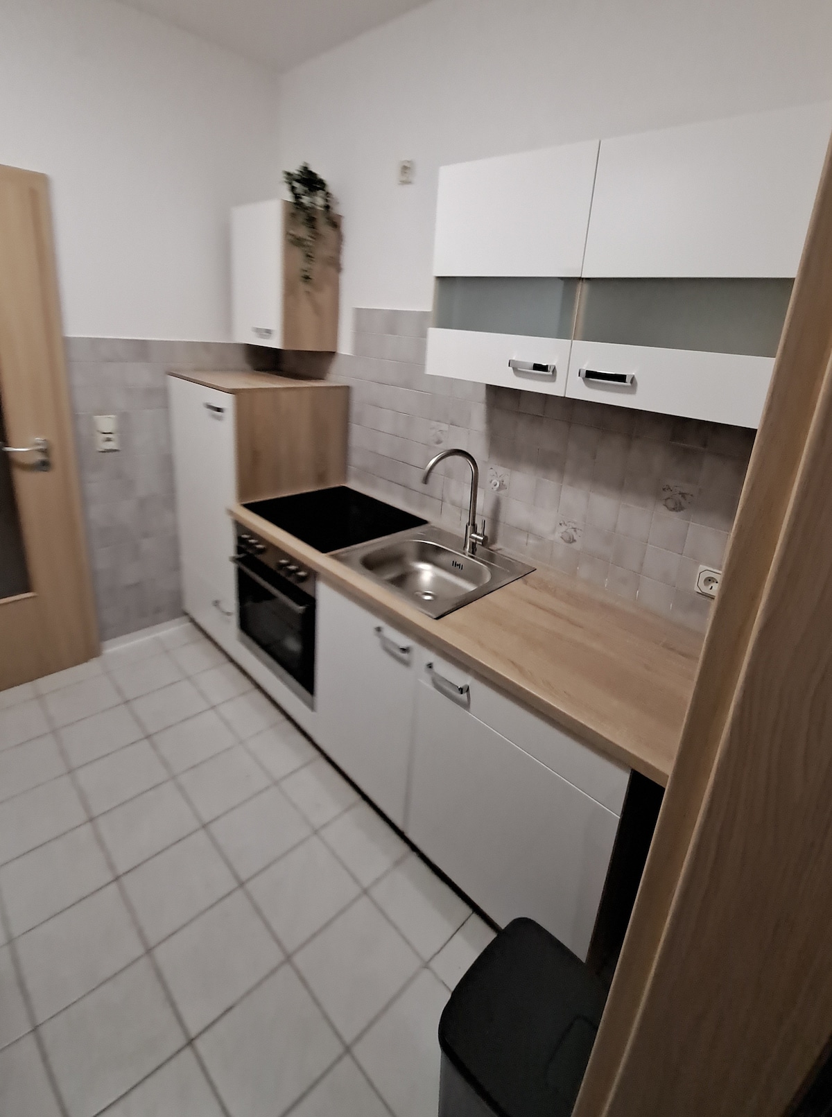 Appartement van 30 m² in een gerenoveerd huis voor twee gezinnen Entree: Hoofdkamer 1,60 m bed, bank (met slaapfunctie 1,30 m breed), eettafel ontworpen als dressoir Keuken volledig uitgerust (premium apparaten, koffie, thee, gratis chocolademelk) tegenover dubbele wastafel links van de ingang tot de open regendouche rechts van het toilet (afsluitbare deur) el. rolluiken grote kamer & toilet Plooien op alle ramen Voertuig(en) kunnen direct voor het pand worden geparkeerd (doodlopende weg)! Tuin nog niet gerenoveerd