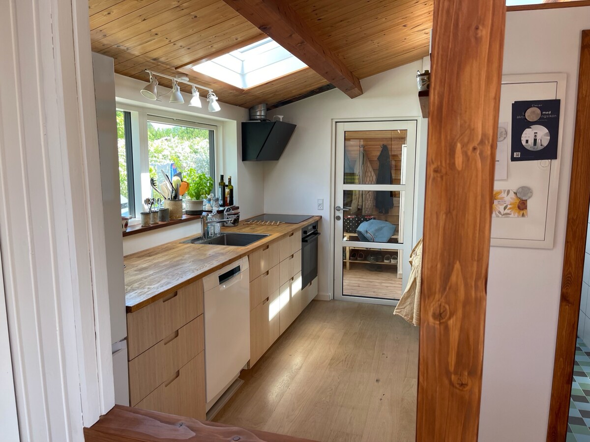 Ruim zwart blokhut met witte ramen en klassieke Deense designmeubels. Hoofdslaapkamer en 2 kamers allemaal met comfortabele bedden. Gerenoveerd en bijgewerkt in 2020-2025 incl. keuken en badkamer. Mooie tuin met gazon ideaal voor croquet of zelfs golftraining (putting)! Vaatwasser en tv. Wifi. Nespresso Pixel koffiezetapparaat voor capsules. Buitenfaciliteiten voor het schoonmaken van pas gevangen vis.