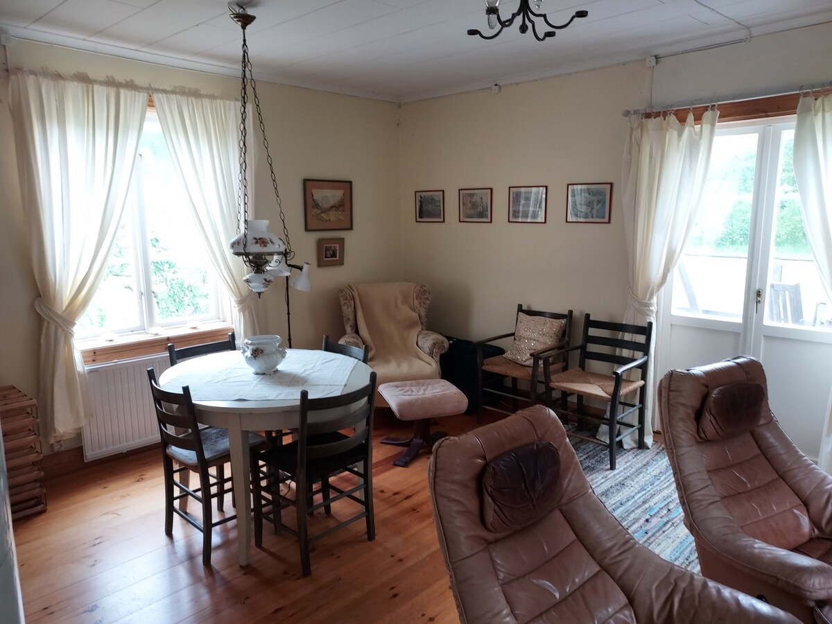 Volledig uitgerust huis van 180 m ² gebouwd in 2016 in charmante, oudere stijl waar keuken en sociale ruimtes zich op de begane grond bevinden en de vier slaapkamers beneden. Vanuit de keuken bereik je een balkon op de bovenverdieping en een glazen patio met infraroodverwarming is eronder. 2 badkamers en wasruimte met wasmachine, droger en droogkast. Het bos waar je wilde aardbeien, bosbessen en paddenstoelen vindt liggen achter het huis en aan de voorkant heb je uitzicht op het meer en weilanden. Onder het huis is er een zwemgedeelte. Honden zijn van harte welkom in deze woning