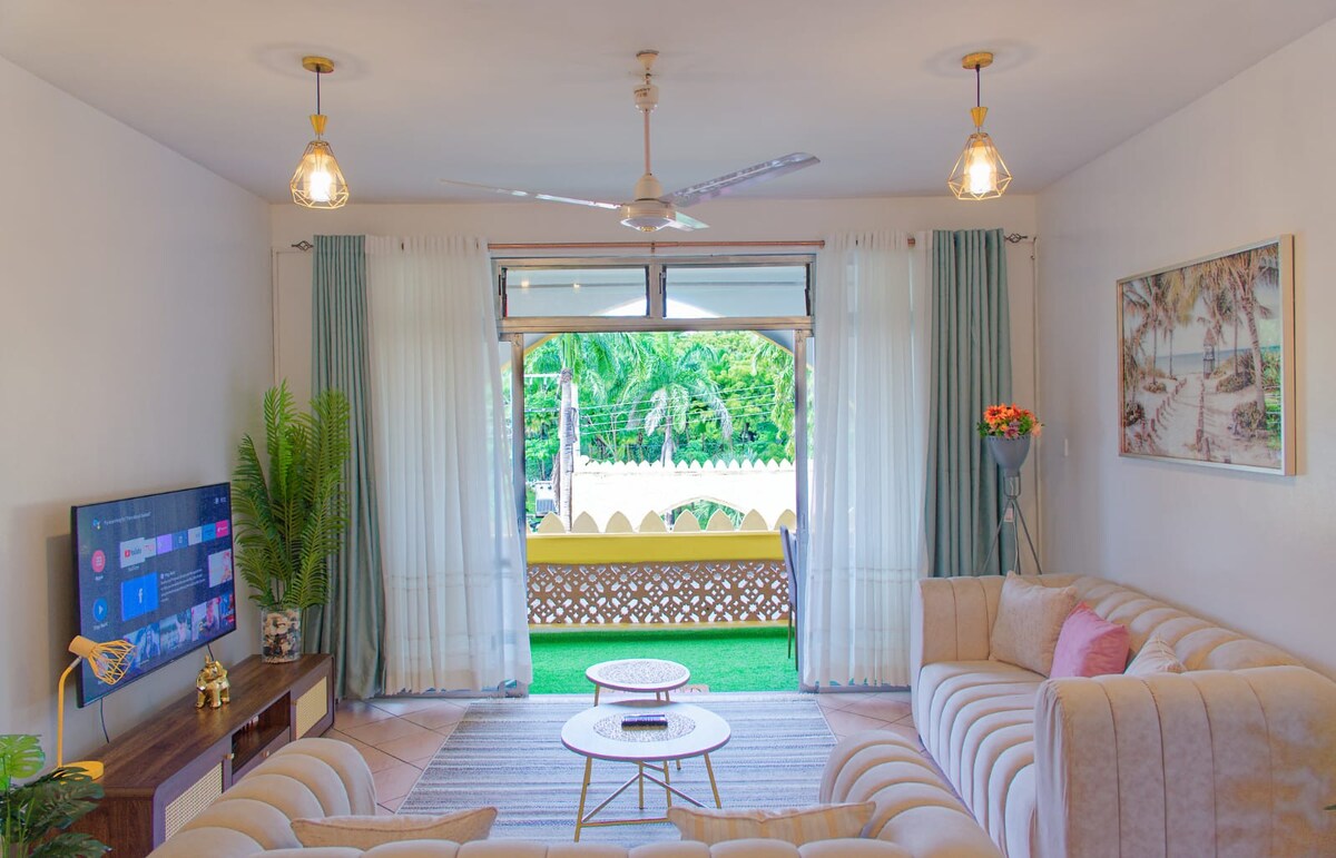 Een eenvoudig, minder is meer interieurinrichting 1slaapkamer huis in Central Diani. Ruim, licht en perfect voor korte of lange verblijven. Een comfortabele grote slaapbankstoel in de woonkamer, flatscreen smart-tv, snelle wifi en een eethoek die kan worden gebruikt als studeer-/werktafel. Volledig uitgeruste keuken, queensize bed in de slaapkamer, een schone badkamer met handdoeken en toiletartikelen. Hoog dak met plafondventilatoren, extra staande ventilatoren, ontvochtiger en grote glazen lamellen voor luchtcirculatie.