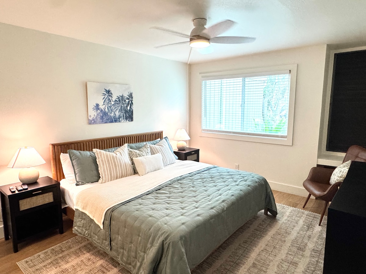 Kom genieten van dit onlangs gerenoveerde, door een ontwerper geïnspireerde, ruime appartement in het prachtige Turtle Bay. Het is net zo comfortabel als mooi. Of het nu ontbijt op bed is of een drankje op de schommel van de lanai, je wilt dit tropische paradijs misschien niet verlaten. Alles is bijgewerkt, inclusief met de hand uitgekozen hangers die kunnen worden gedimd die passen bij je stemming. Er is een nabijgelegen zwembad, strand en tropische wandelpaden. Restaurants en winkels zijn te vinden in het onlangs gerenoveerde Turtle Bay hotel.