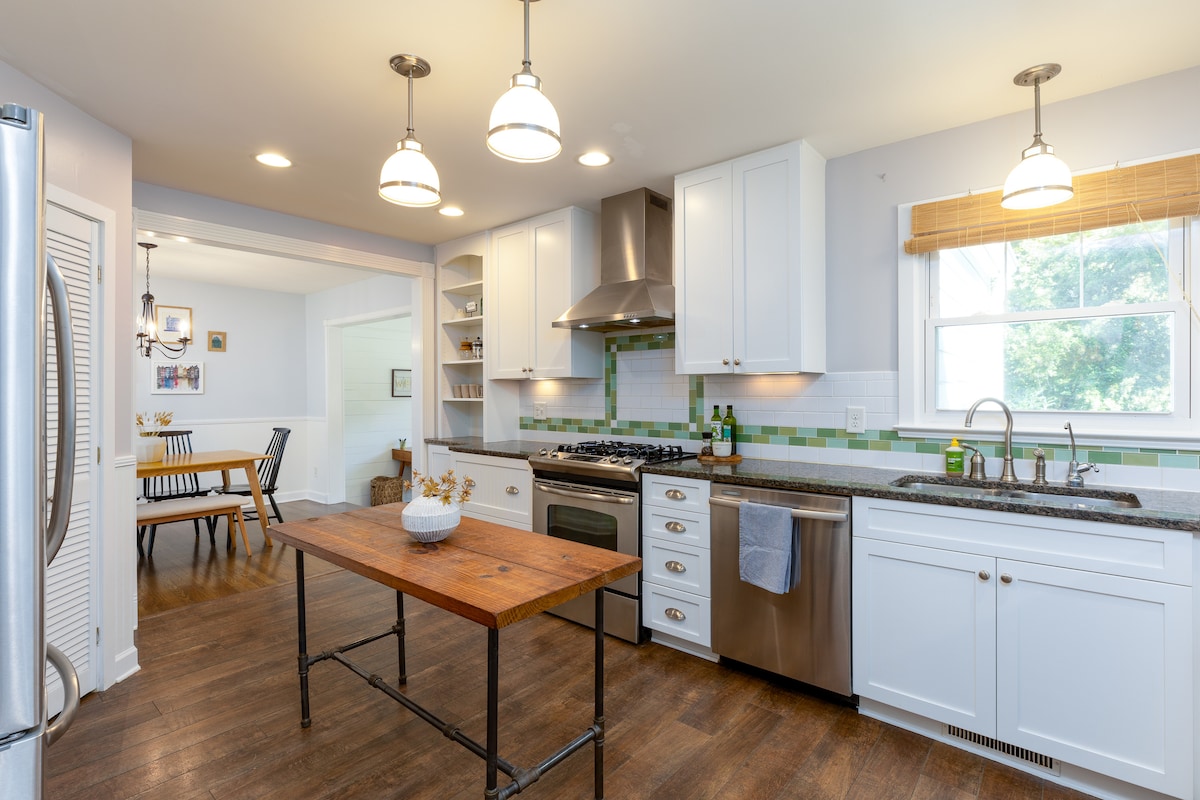 Make unforgettable memories in this spacious, beautifully designed home for you + 9 guests! Perfect for family gatherings, sporting events, & special occasions. Located in heart of Downtown Durham, just 4 mins from Duke, Bulls stadium, DPAC, & Tobacco Trail. Cozy up around the fire pit, enjoy a BBQ, or relax w/fresh popcorn & vinyl records. Retire in luxurious beds + sheets & head to the gourmet coffee bar in the AM. Free access to nearby gym w/pool. 4 air mattresses and EV charger avail.