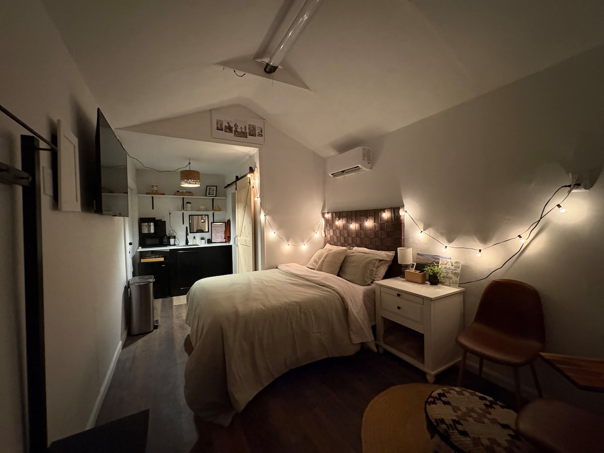 "Private Entrance" 2e verdieping STUDIO met veel ramen. Houten vloeren, centrale airconditioning/verwarming, 1/2 bad, queensize bed met nieuw matras, koelkast, Krueig, magnetron, WIFI, tv, kastruimte, BADJASSEN VOOR EIGEN VERWARMDE BUITENDOUCHE en handdoeken. Gevestigde buurt op minder dan 3 mijl van FSU en het centrum; 1 blok naar Tallahassee Memorial Hospital. Restaurants op minder dan een halve mijl! Het is op ons terrein en we maken de studio persoonlijk schoon. Go Noles!
