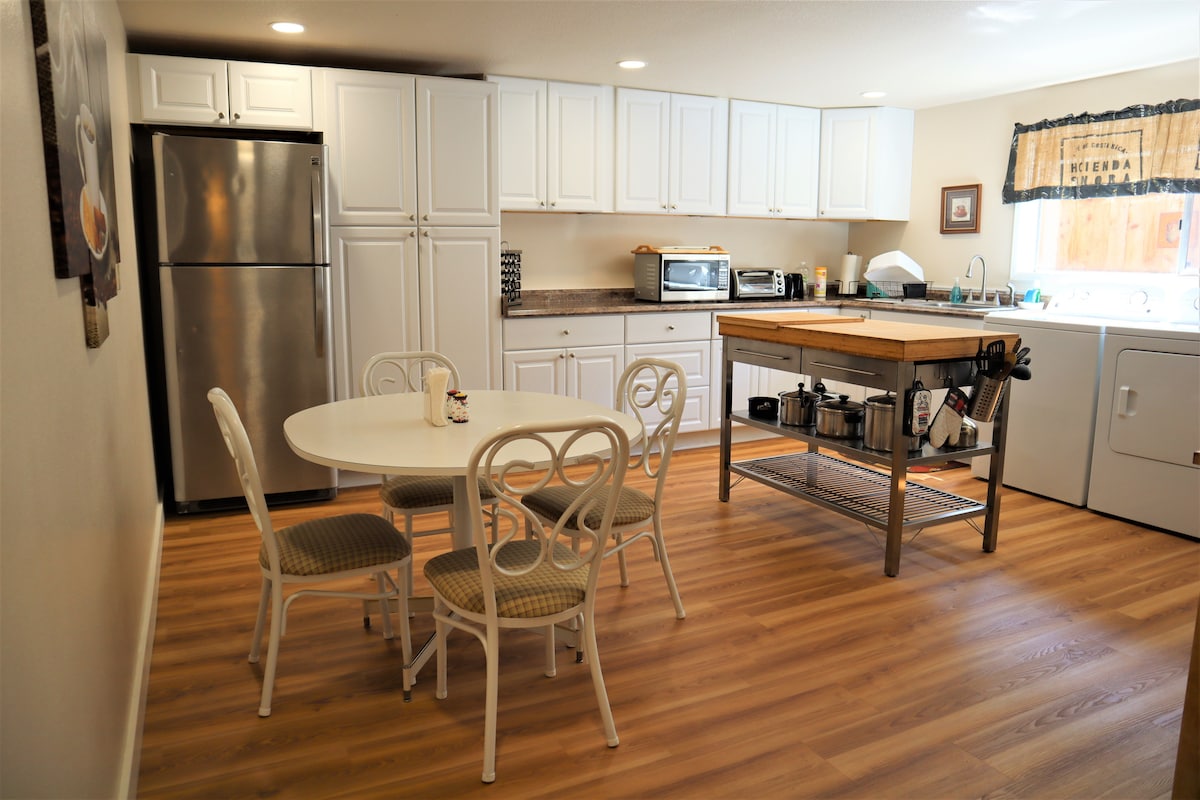 Eigen ingang naar een klein appartement met een slaapkamer of een ruimte voor de schoonmoeder. Gestapelde wasmachine/gasdroger.. koelkast.. kookplaat.. magnetron.. alles wat je nodig hebt om een maaltijd te koken of te grillen. Terwijl je weg bent voor de dag leeg ik de prullenbak... verzamel ik recyclebare materialen... en ruim ik de keuken en badkamer voor je op. Je komt elke dag terug naar een schone, rustige ruimte en ontspant. Ga in de hot tub of sauna zitten of ga op het terras zitten en geniet van de schoonheid van de natuur en luister naar de geluiden van vogels en dieren om je heen.