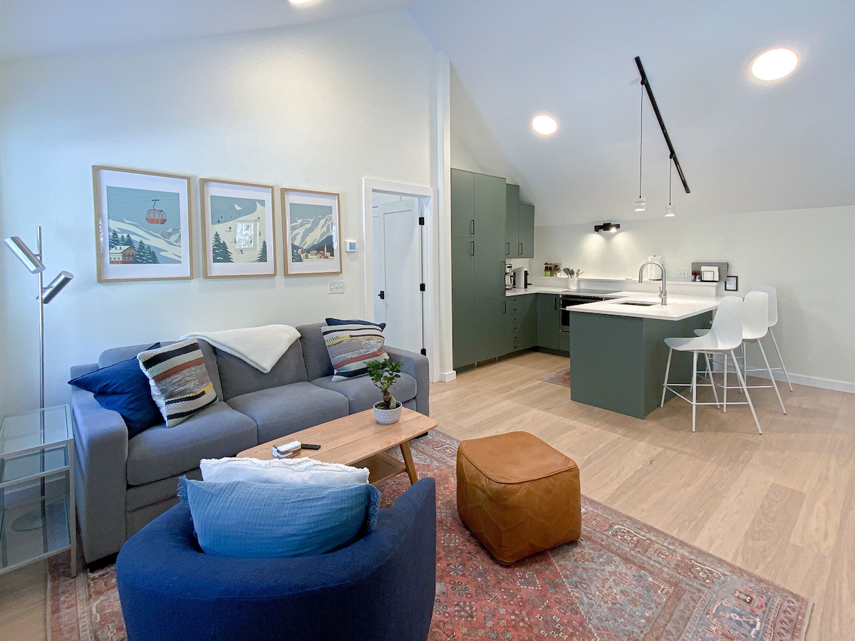 Trek je ski- of snowboardschoenen uit en hang je spullen op om te drogen in de handige modderkamer. Loop dan de lichte en luchtige studio binnen waar voldoende zitplaatsen zijn. Je kunt binnen dineren of uitgaan, we hebben een kitchenette met magnetron, kleine koelkast en mini-roosteroven, we hebben geen grote oven. 's Avonds kun je je boven terugtrekken in een ruim slaapgedeelte met uitzicht op de hele studio. We wonen fulltime op het terrein in het hoofdhuis, de garage/schuur scheidt ons van het huisje.