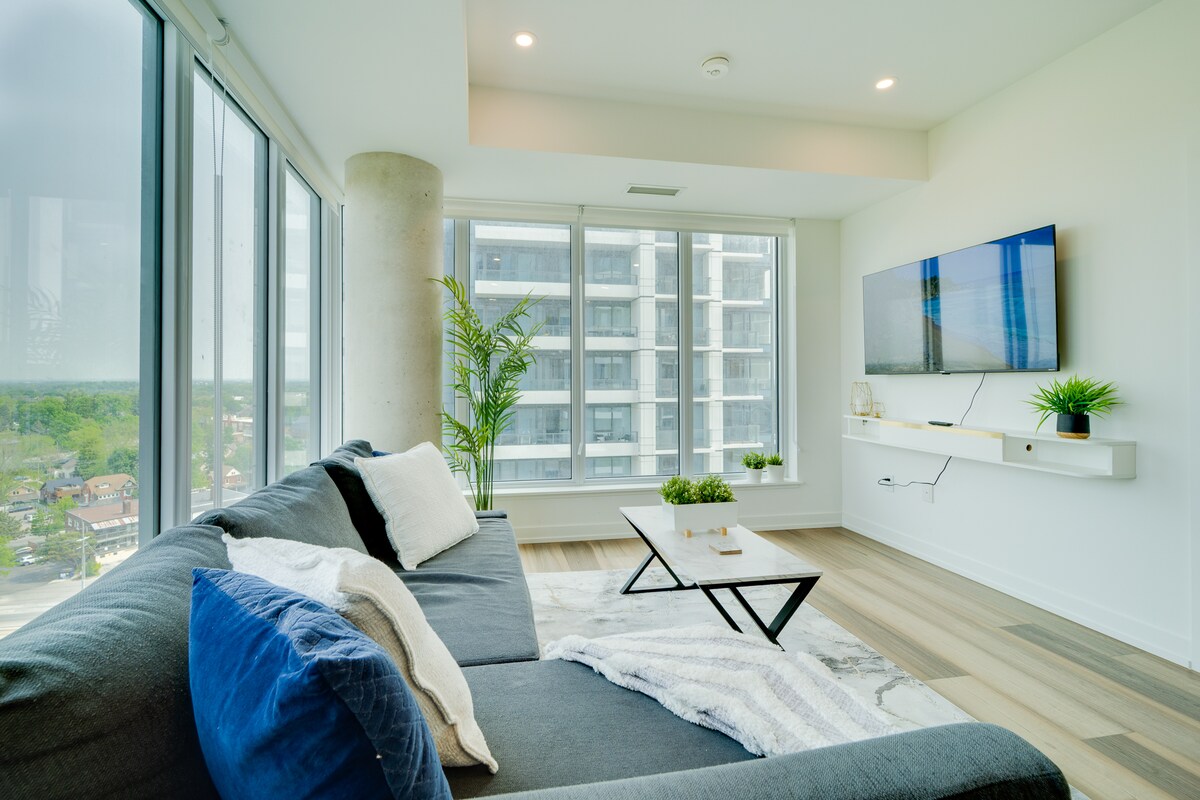 Welkom bij ons open concept hoogbouw met uitzicht op de stad in het hart van Kitchener-Waterloo, waar stijl en comfort samenkomen om een onvergetelijk verblijf te creëren. Deze open conceptunit met 1 slaapkamer is met zorg ontworpen voor maximaal 4 gasten, waardoor het perfect is voor koppels, kleine gezinnen of solo-reizigers die op zoek zijn naar een modern en gezellig toevluchtsoord. ✔ Volledig uitgeruste keuken ✔ Comfortabele slaapkamer met queensize bed ✔ Open Concept Woonruimte ✔ Supersnelle wifi ✔ Gratis parkeren ✔️Toegang tot fitnessruimte Lees hieronder meer over meer informatie!