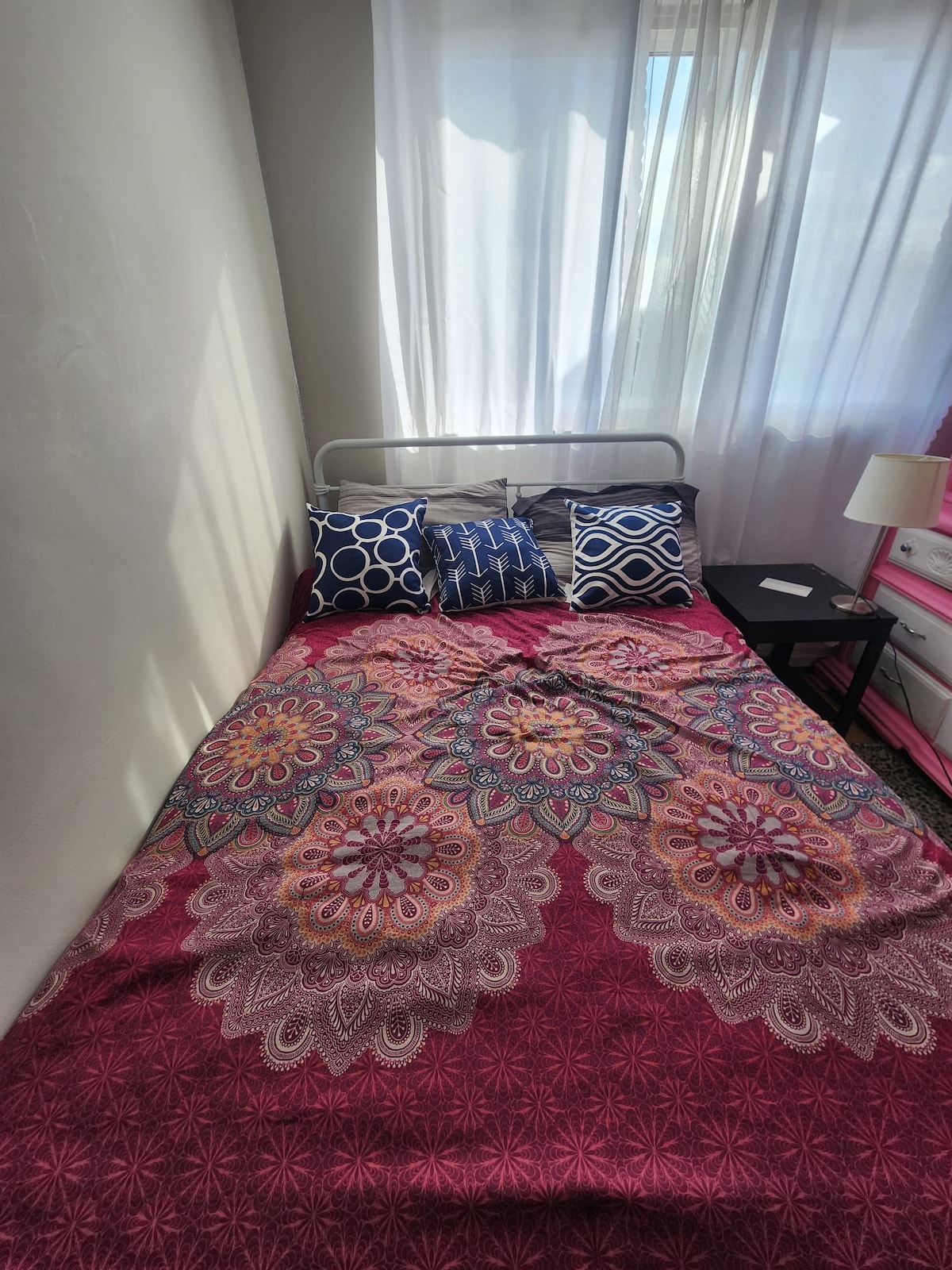 Eigen ingang naar een grote (10x20) slaapkamer/woonkamer. De kamer heeft verwarming/airconditioning, een koelkast/vriezer op formaat van een appartement, een tweepersoonsbed, een verstelbare leren loveseat, een kledingkast, planken, een bureau en een stoel. Een 2-delige wasruimte bevindt zich in het huis direct tegenover je kamer. Gedeelde douche/bad op de eerste verdieping. Perfect voor studenten of werkende individuen. Parkeren op straat april-november. 2 minuten lopen naar het openbaar vervoer, 40 minuten lopen naar de universiteit, 10 minuten lopen naar de supermarkt, restaurants, bank.
