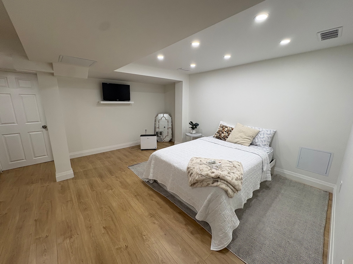 Deze slaapkamer bevindt zich op de benedenverdieping van ons huis met een eigen keuken en wasruimte, de badkamer bevindt zich op de begane grond bovenaan de trap van je eigen ruimtes waar er een deur met slot is, dus alles beneden is ook privé voor jou!