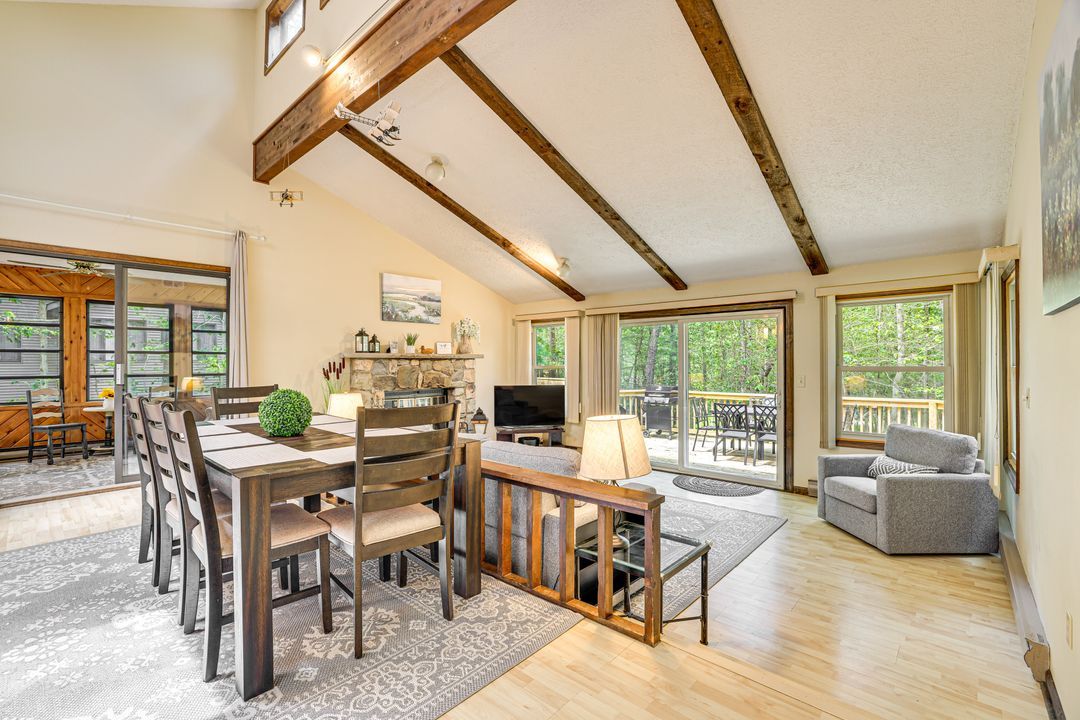 All-season modern chalet on private lot. Boasts vaulted ceilings, skylights, and rustic accents. Adjacent Game Rooms, Gym, Lvl 2 EV Charger, 2 Decks, Firepit, gathering spaces, Fireplace, Workspace. Amenity-filled Big Bass Lake offers pool access, lakes + more. Loaded for comfort: comfy mattresses/pillows, well-equipped kitchen, large 4K Roku TVs all over, Playstation 4, Billiards, Foosball, Air Hockey, Arcades, Weber Grill, central AC/heat. Plenty of space for groups big & small, pet friendly!
