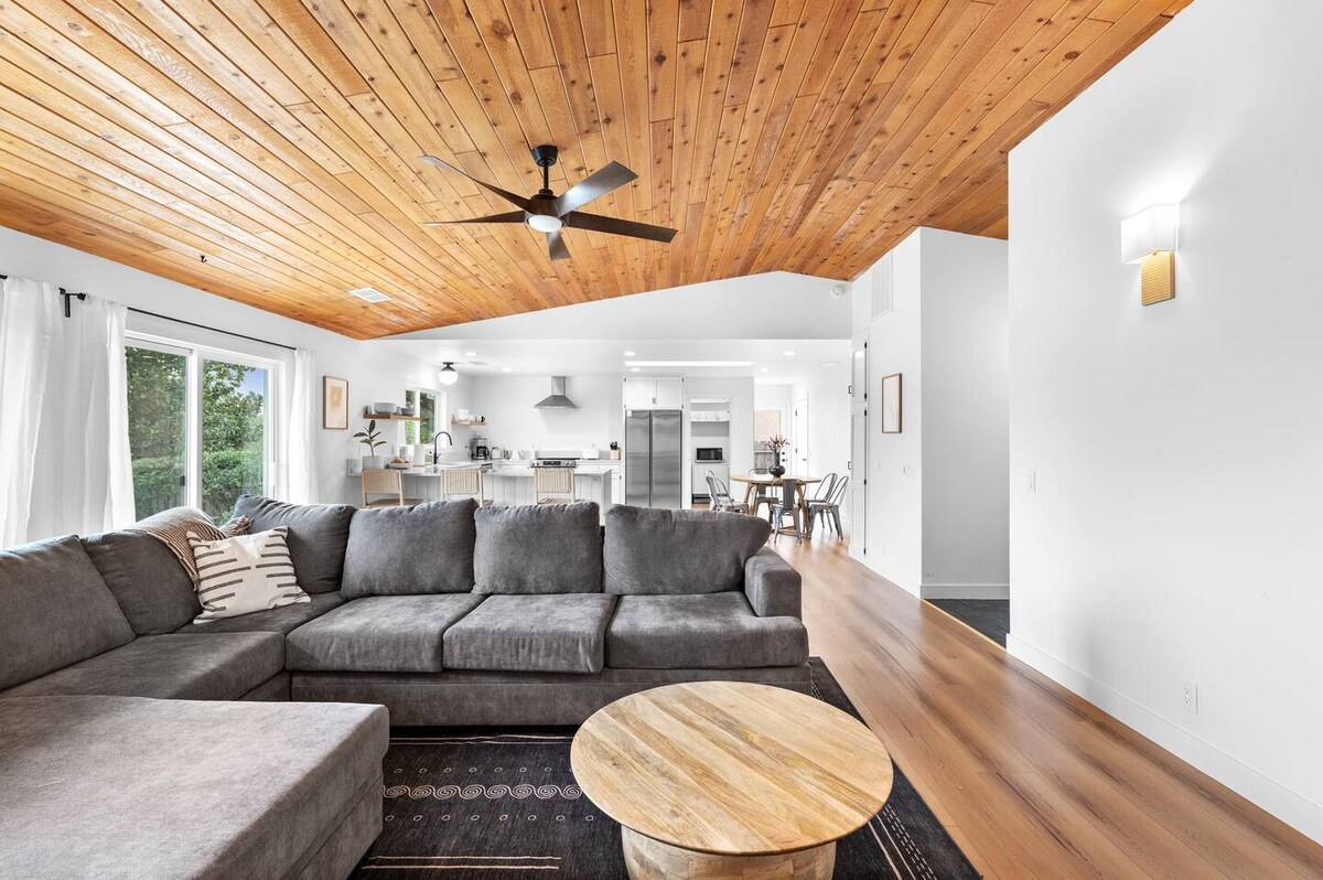 Make this newly remodeled upscale modern getaway your home base for Northern California adventures! You'll be delighted to return to its charming comforts and designer furnishings after your daily adventures. A slanted roof with exposed wood beams opens up the living area with a fireplace, while the open-concept floor plan allows natural light to spread throughout the whole room. The pristine home is surrounded by opportunities for outdoor recreation and close enough to walk to Bethel Church.