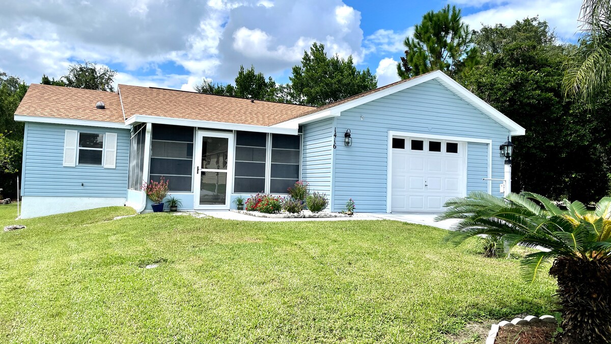 Mooi blokhut gastenverblijf. Een uitstapje op het terrein, genesteld in een bosrijke omgeving. Voorzien van ruime grote kamer met een gezellige lodge gevoel, 2 slaapkamers en 2 volledige badkamers. Complete keuken en wasserette. Gescreend op de veranda, verharde oprit en carport. Nieuw geïnstalleerde werkende orkaanluiken! In de omgeving restaurants en vele restaurants binnen tien mijl. Geweldig om te wandelen of fietsen. Ontspan en geniet van het winkel- en restaurantaanbod van The Villages, maar kom terug in rust, schoonheid en rust.