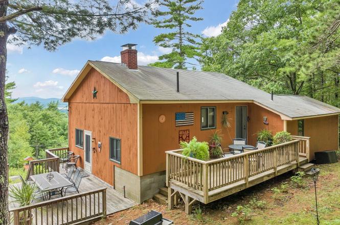 Rustiek Chalet op de bergtop genesteld tussen de dennenbomen. Prachtig uitzicht op Gunstock Mountain Ski Area en op Lake Winnipesaukee vanaf het grote dek. Slechts enkele minuten naar de skipistes in de winter of naar het meer in de zomer. Een glazen houtkachel aan de voorkant voor koude nachten en een vuurplaats buiten vuurplaats voor het roosteren van marshmallows. Bordspellen, een tafelvoetbaltafel en een airhockeytafel voor familieplezier. Rustig & vredig!