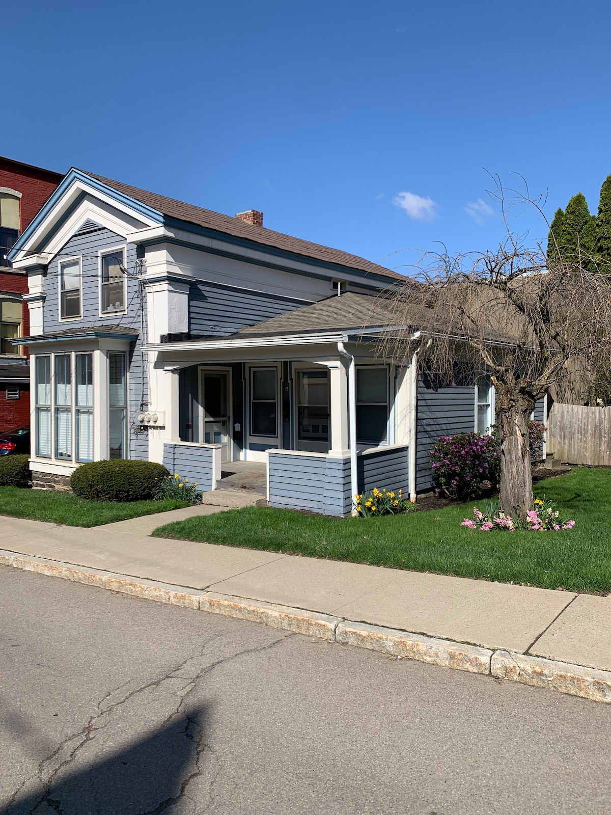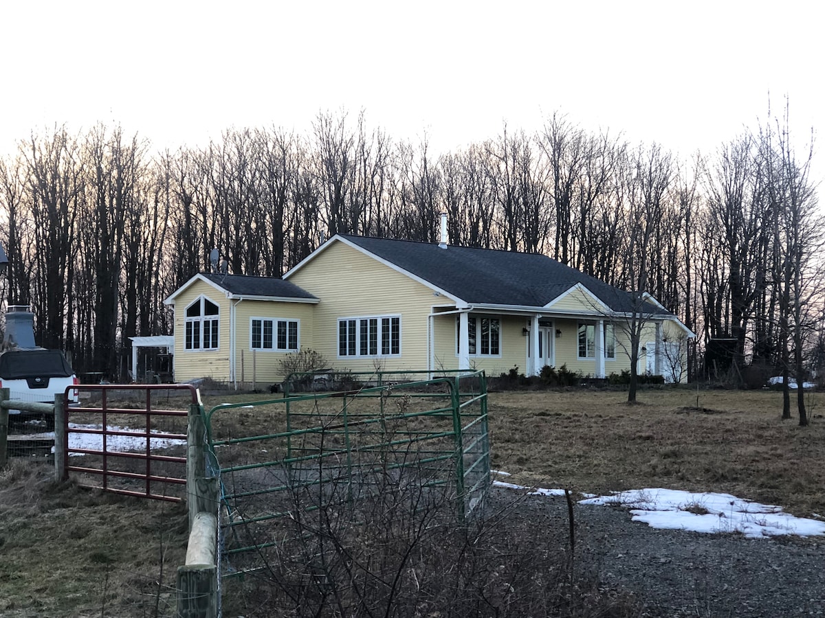 Ontspan in een grote privésuite in een rustige en historische bakstenen woning uit de jaren 1850 op een kleine boerderij en paardenpension in Alfred Station. Een thuis weg van huis, gunstig gelegen op minder dan tien minuten van de I-86, Alfred State en Alfred University. Geniet van exclusief gebruik van de eigen ingang, ouderwetse veranda, omringende overloop boven, grote slaapkamer, gezellige woonkamer en ruime badkamer. Neem contact met me op als je een kleinere suite wilt met 1 queensize slaapkamer.