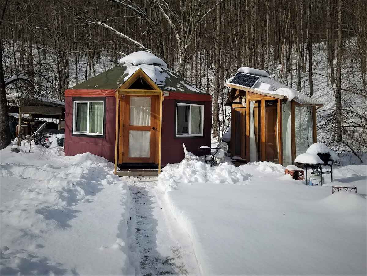 5 minutes from Phoenicia. A comfy Yurt for 2 amid wild elderberry, peach, pear and apple trees, a goldfish pond and forested hills. A secret meadow for sun worshiping, meditation and watching dark milky way skies. Cold, UV purified spring water. Skiers welcome: Cozy heat in the Yurt down to zero! The gas fired hot shower is glass enclosed. Fast WiFi. Odor-free composting toilet. Mini-kitchen, fire circle and gas grill. All people of every race, religion, gender and nationality are welcome here!