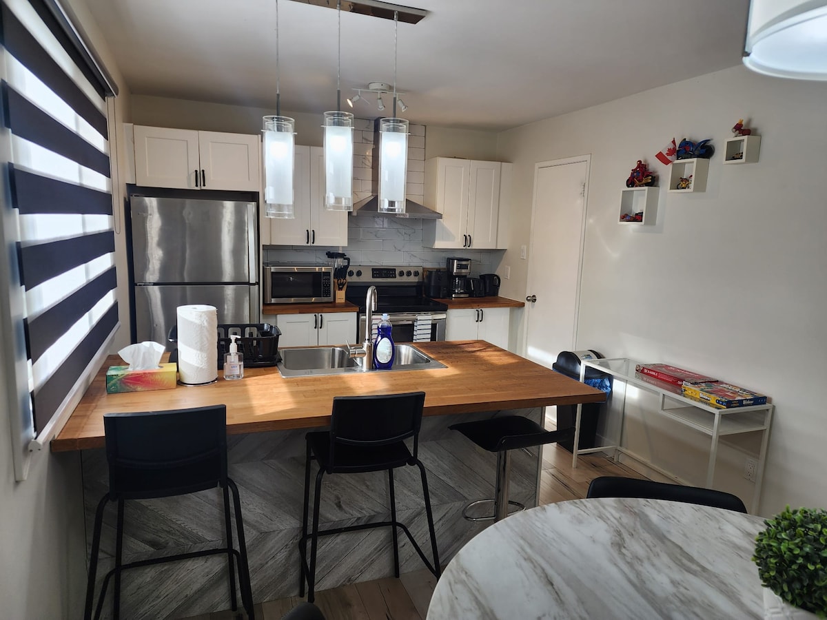 Gerenoveerde 1 slaapkamer - erkende keldersuite met eigen ingang (zelf inchecken). Het beschikt over een eigen bad, barbecuegrill in de achtertuin - nieuw terras (als het weer het toelaat). Wet Bar met Keurig, magnetron enz. voor je eetbehoeften en koffie. Kookplaat op aanvraag. Locatie is in de buurt van Harris Meat & Grocery, op 2 minuten afstand van de bushalte, 3 minuten rijden naar McDonalds en 6 minuten rijden naar winkelcentra. Geniet van deze gezellige plek met je dierbaren en vrienden. Kortingen beschikbaar voor een verblijf van een week!