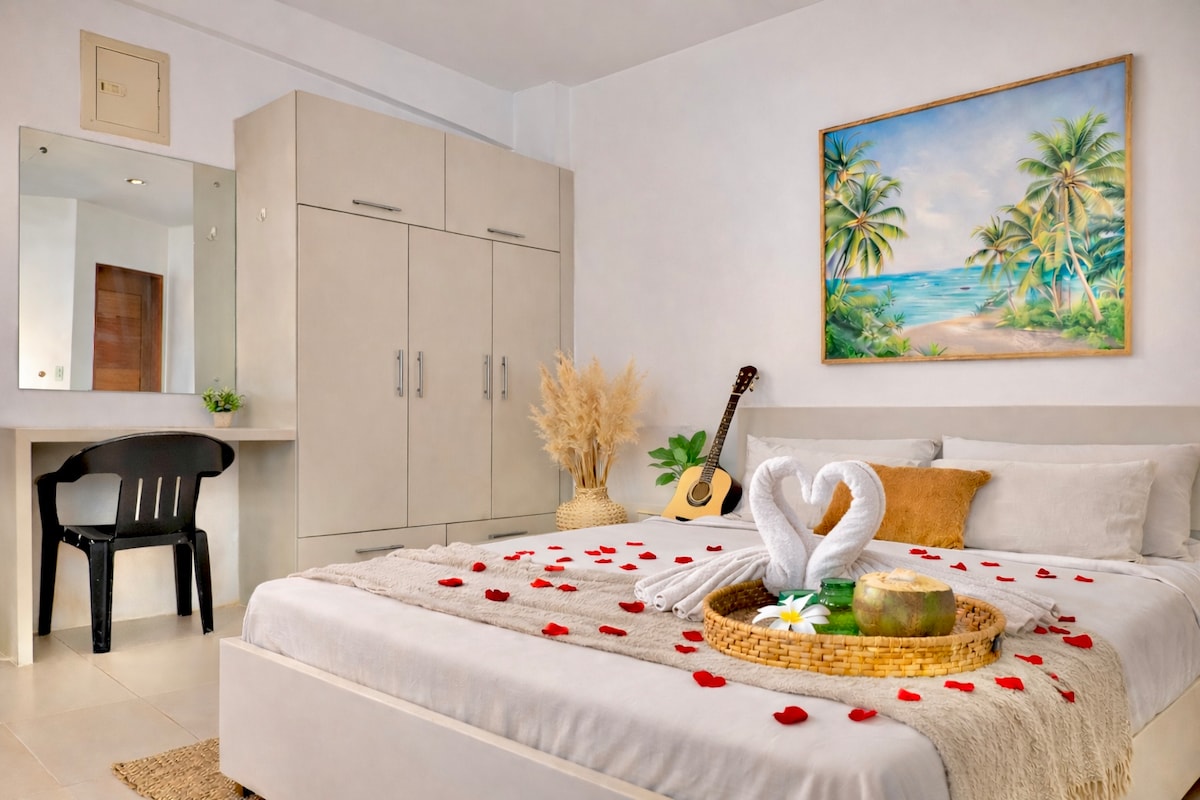 Word wakker met het uitzicht op het witte zand van Boracay vanaf je eigen balkon met uitzicht op zee. Dit appartement met twee bedden ligt op slechts 30 seconden van het strand en biedt airco, generatorback-up, snelle wifi, een volledige keuken en alles wat je nodig hebt voor een comfortabel verblijf. Ideaal voor koppels of gezinnen die op zoek zijn naar een rustig verblijf, je balkon is de perfecte plek voor ochtendkoffie of het delen van drankjes bij zonsondergang met vrienden. En als je klaar bent om Station 1 en 2 bars, restaurants en uitgaansgelegenheden te verkennen, liggen op slechts een korte loopafstand van het strand.