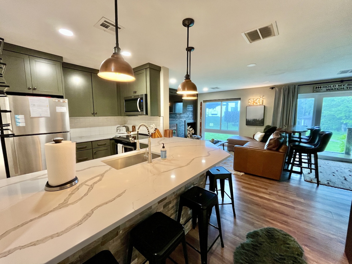 Welkom in deze ongelooflijke, volledig gerenoveerde echte houten woning met een enorme entertainmentruimte bestaande uit een pooltafel, tafeltennistafel en meer 🔥 3 grote slaapkamers, samen met een extra kamer met een slaapbank. Er zijn 3 privé slaapkamers of gebruik het als 4 met een muur scheiding. Volledig uitgeruste keuken met kwarts aanrechtbladen en roestvrijstalen apparaten. Grote veranda met veel meubilair en een achterdek met uitzicht op een boerderij. Enorme garage voor 2 auto 's voor parkeergelegenheid en een oprit! 🚘